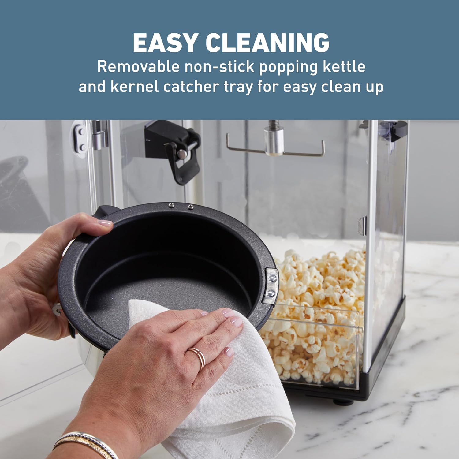 EASY CLEANING: Removable non-stick popping kettle and kernel catcher tray for easy cleanup