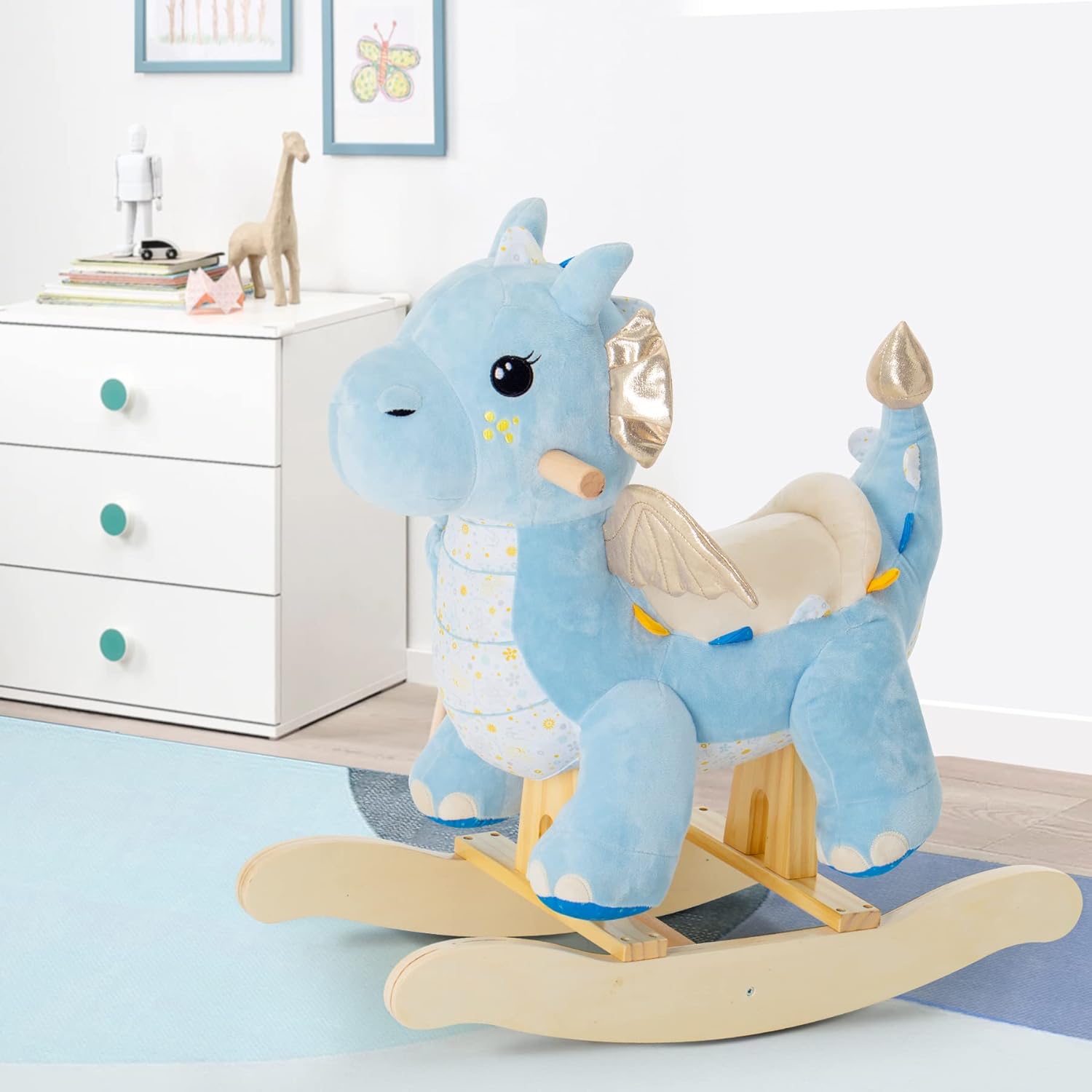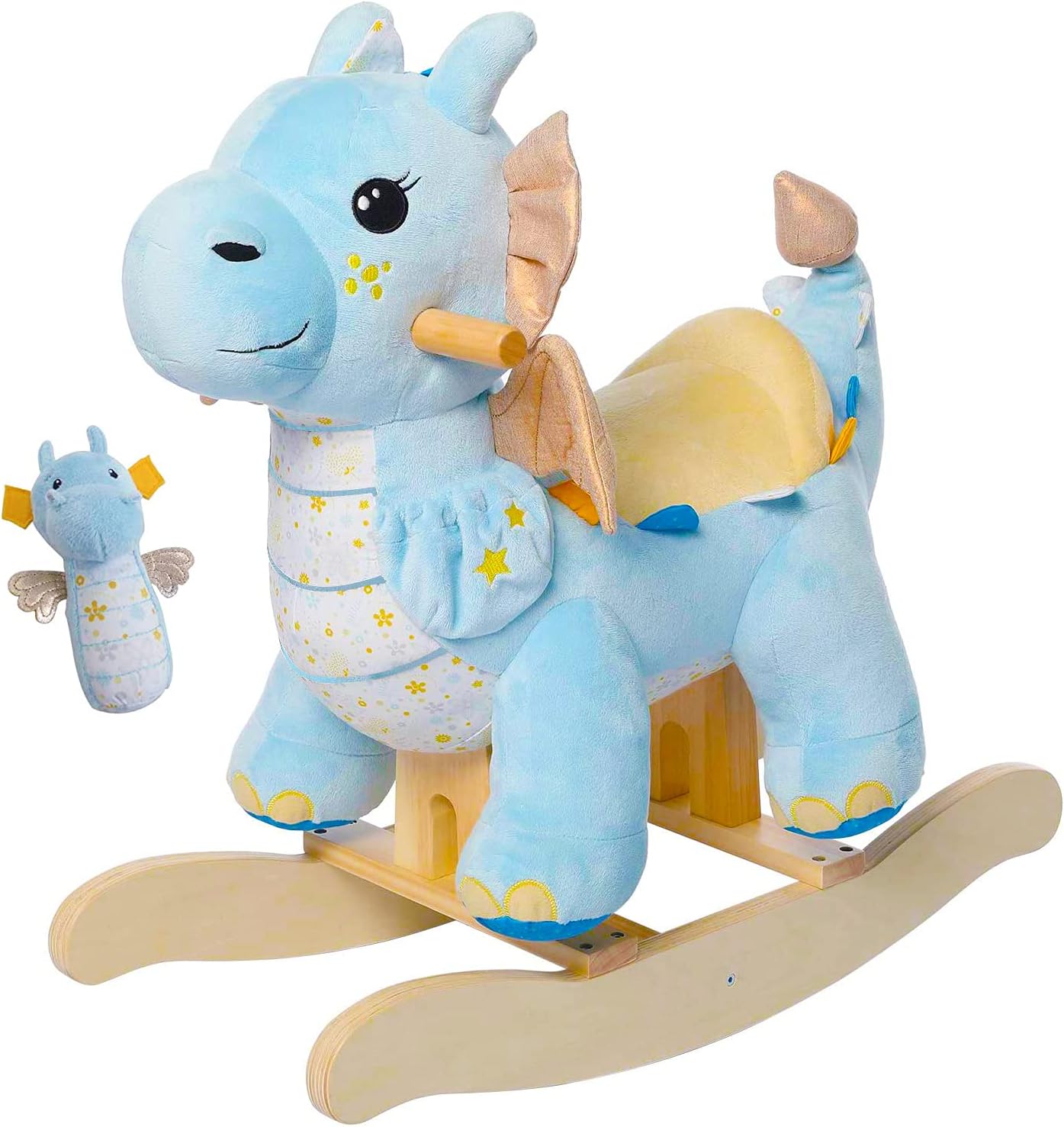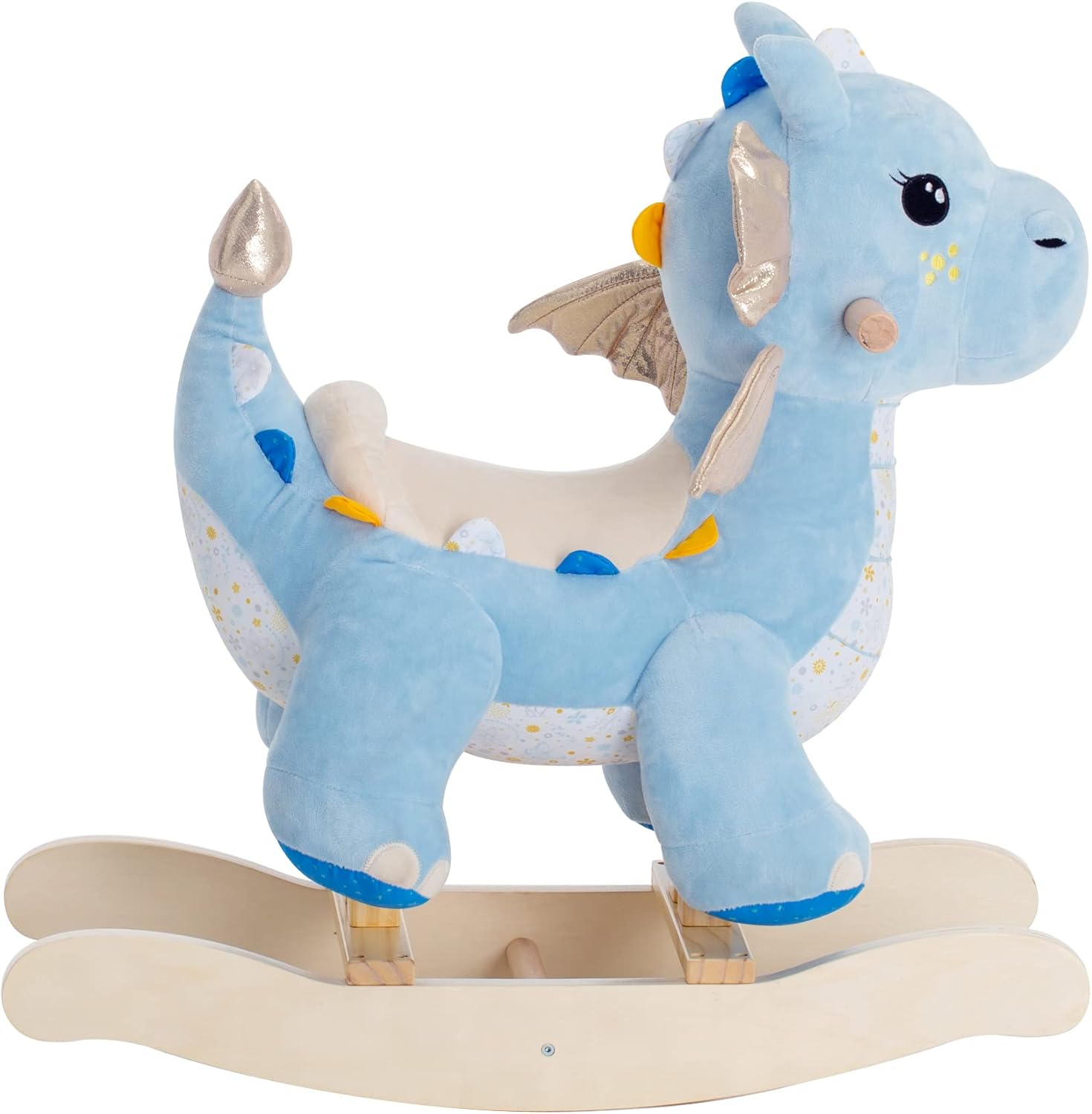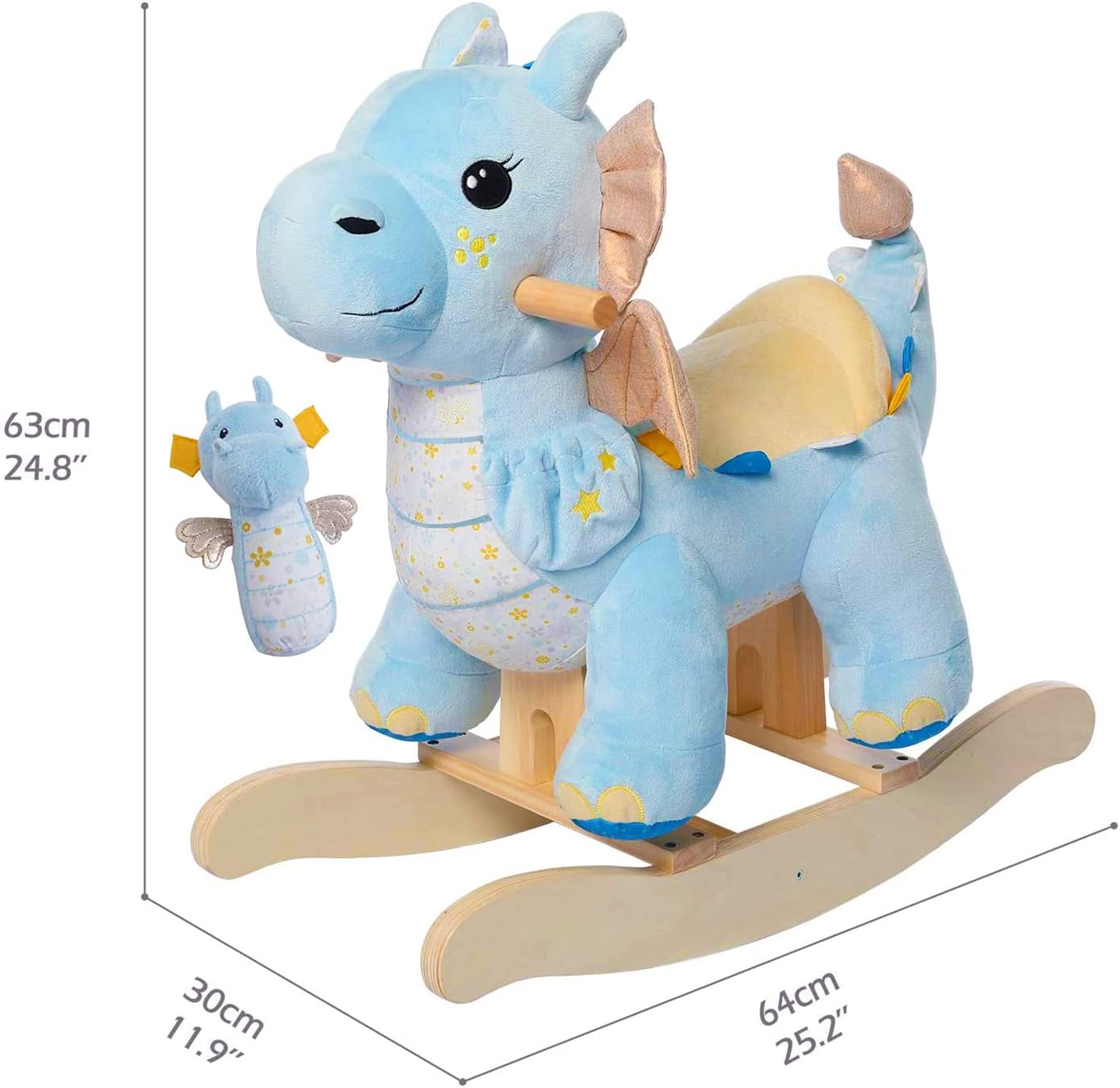 - Exquisite gifts & attentive details - Cute dragon doll in the front pocket.Hidden bells in the end of the tail.Happy sound will made when touching wings.Cushion designed for baby. This cute blue dragon rocking horse is a great gift for children on holidays or birthdays.