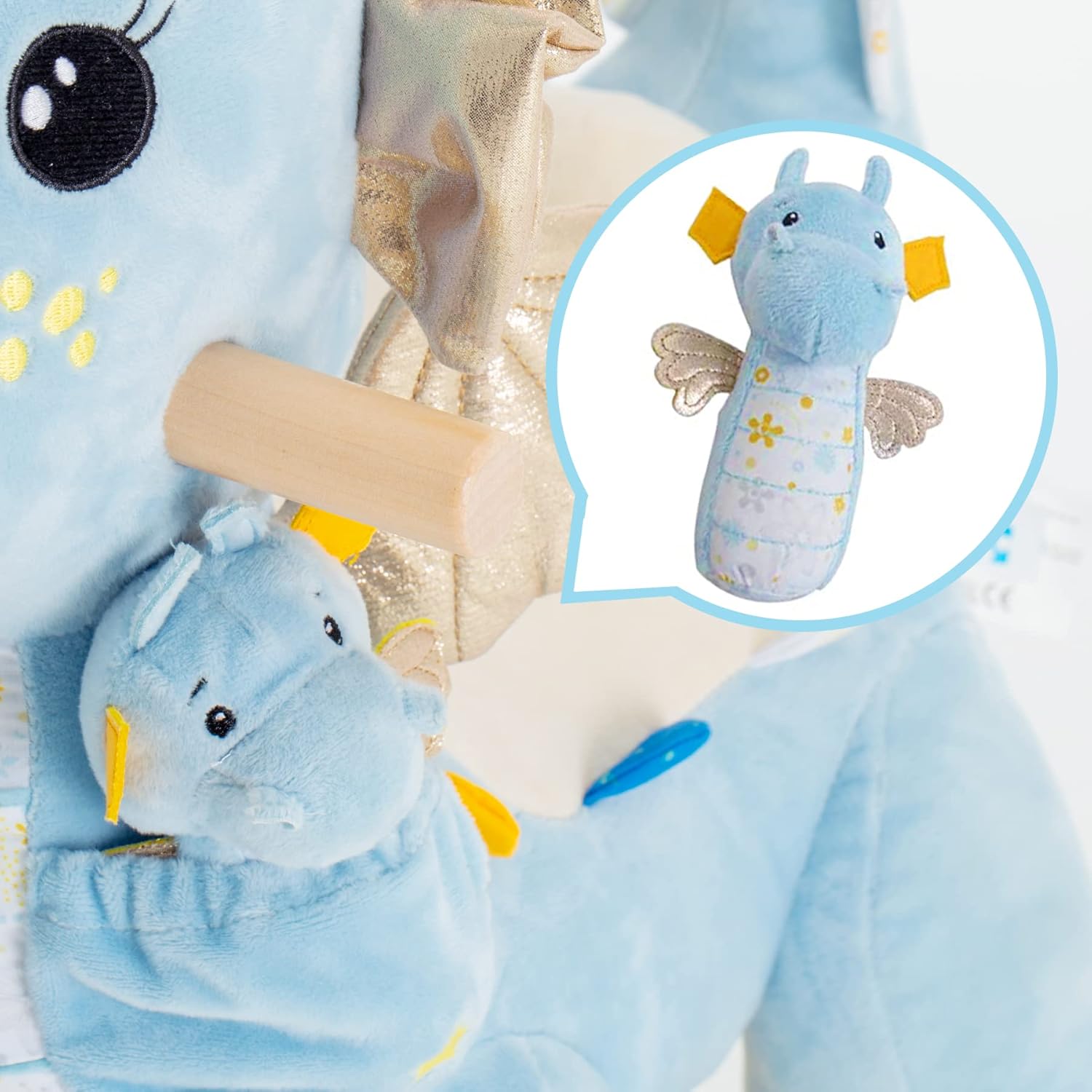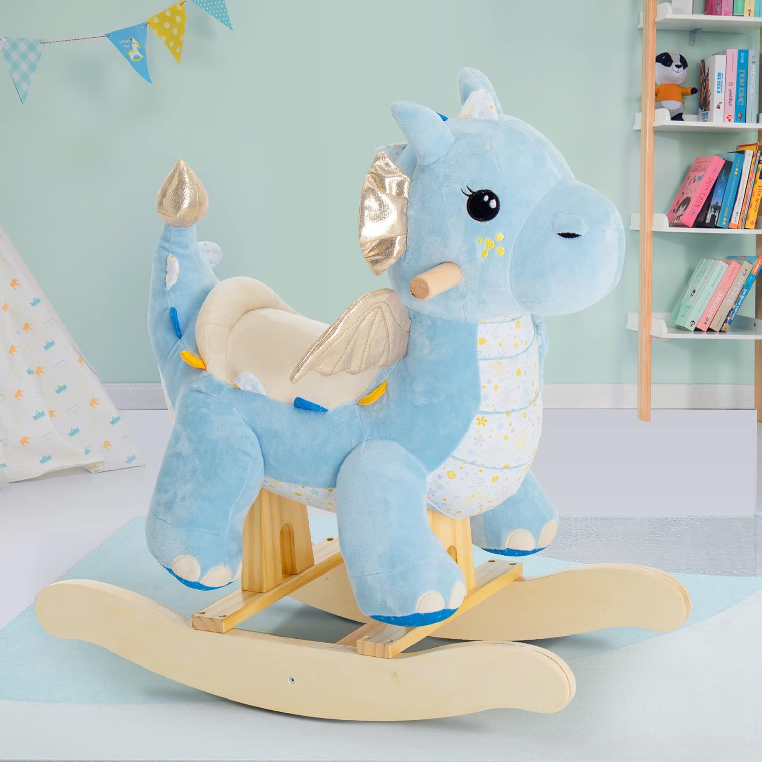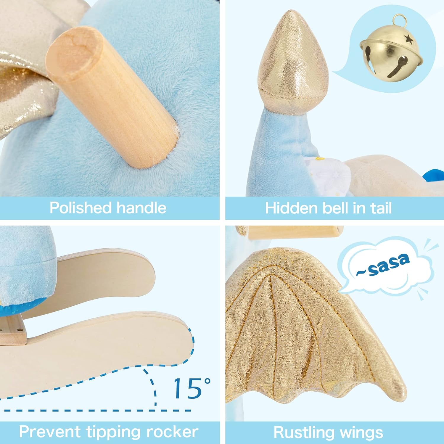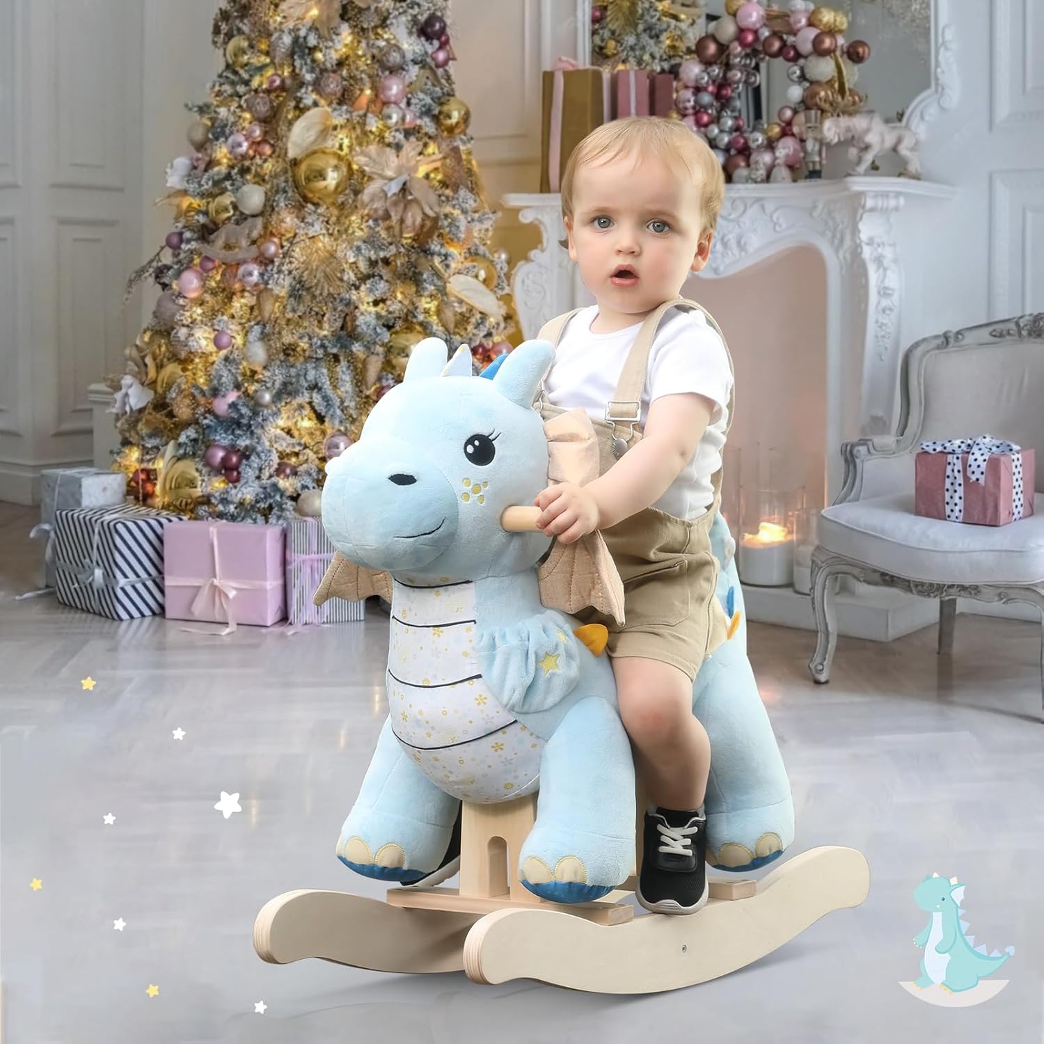 - Exquisite gifts & attentive details - Cute dragon doll in the front pocket.Hidden bells in the end of the tail.Happy sound will made when touching wings.Cushion designed for baby. This cute blue dragon rocking horse is a great gift for children on holidays or birthdays.