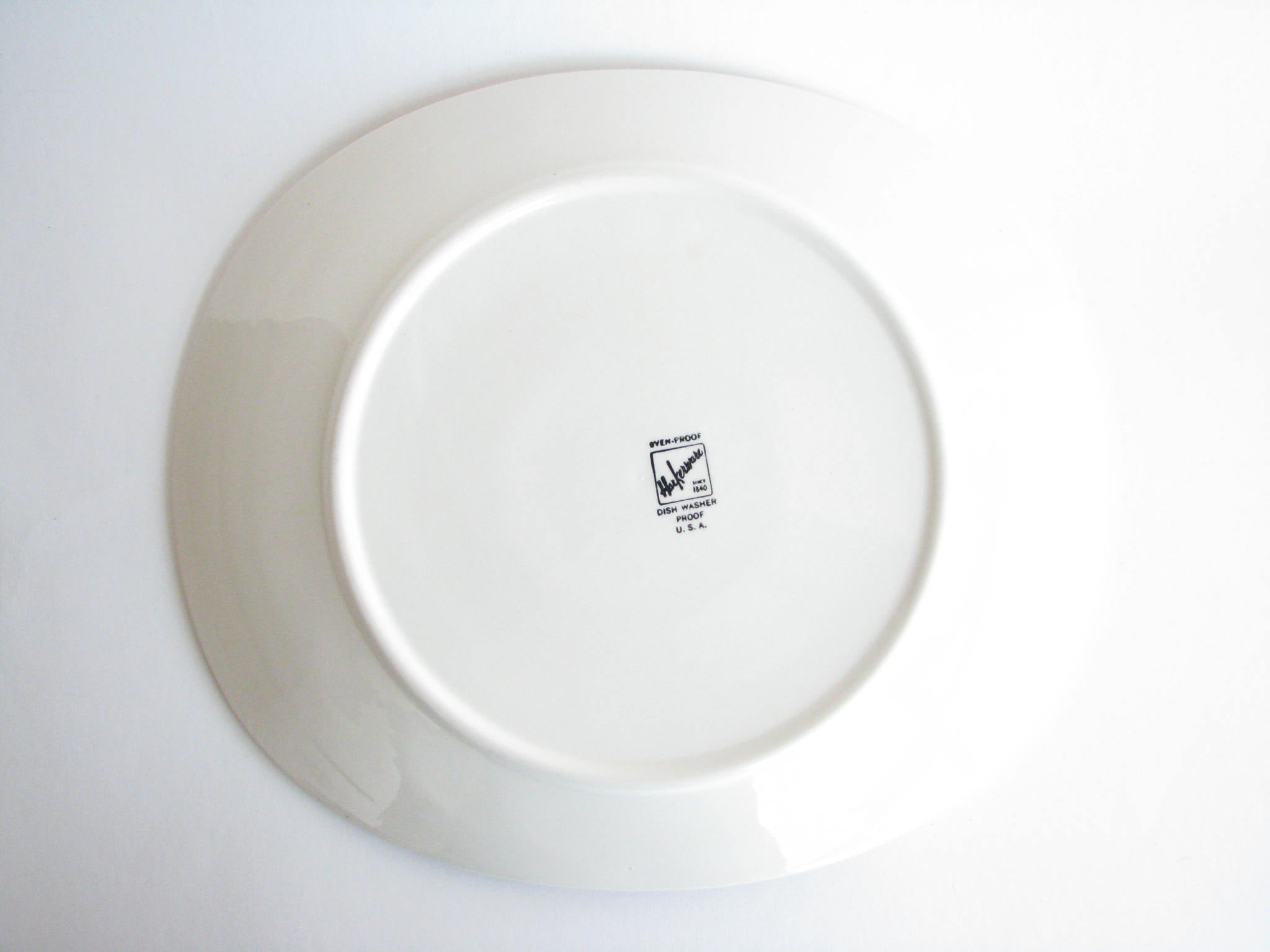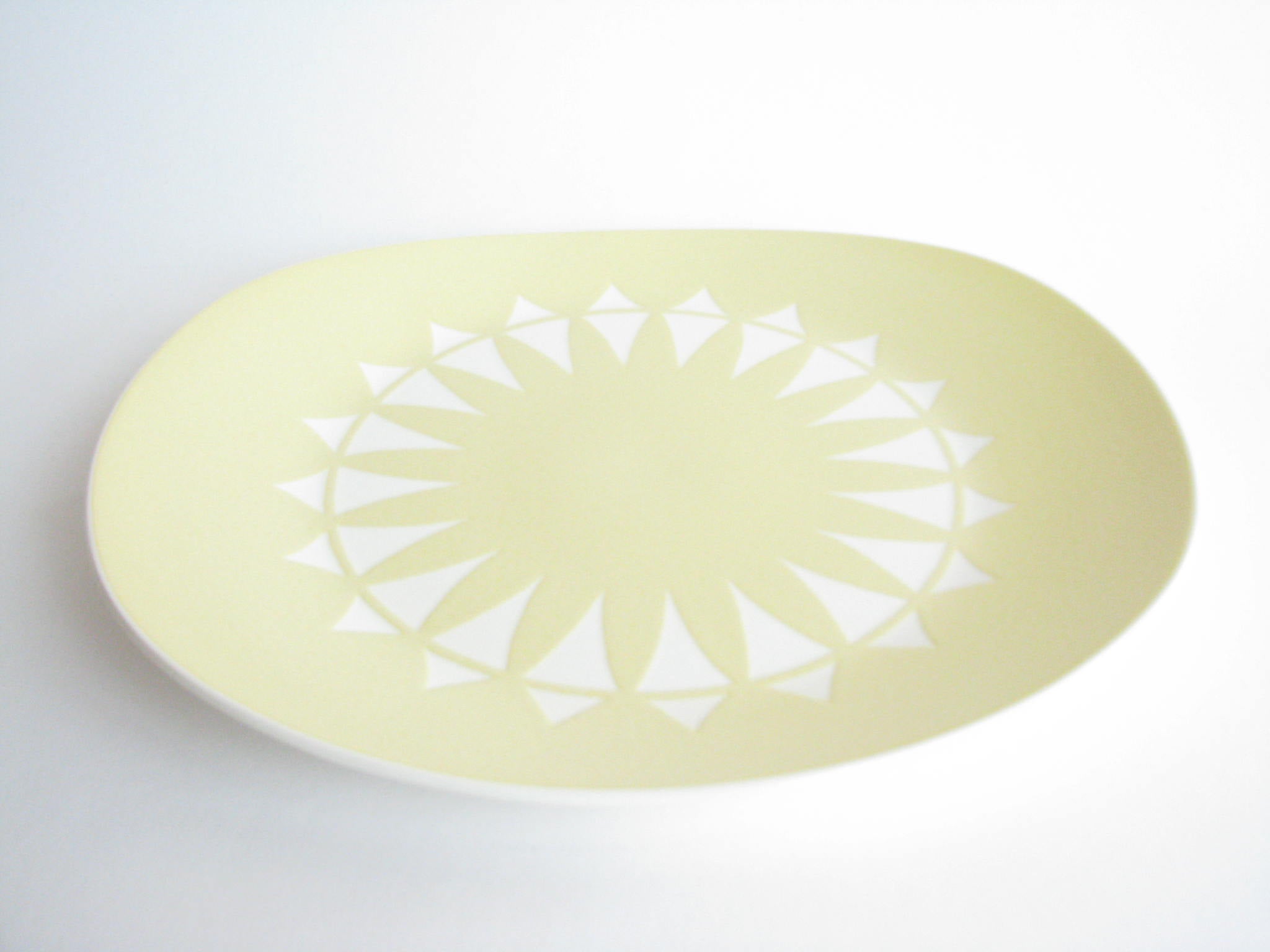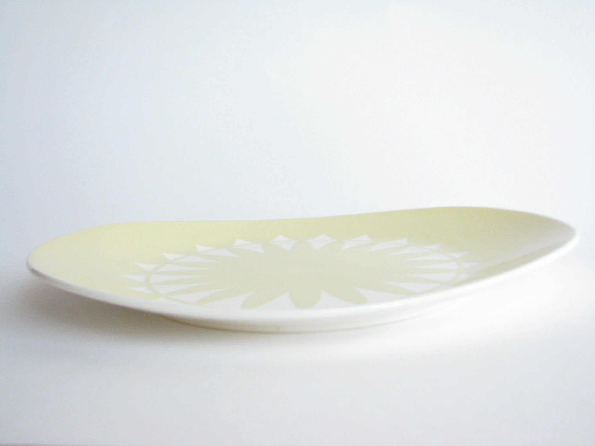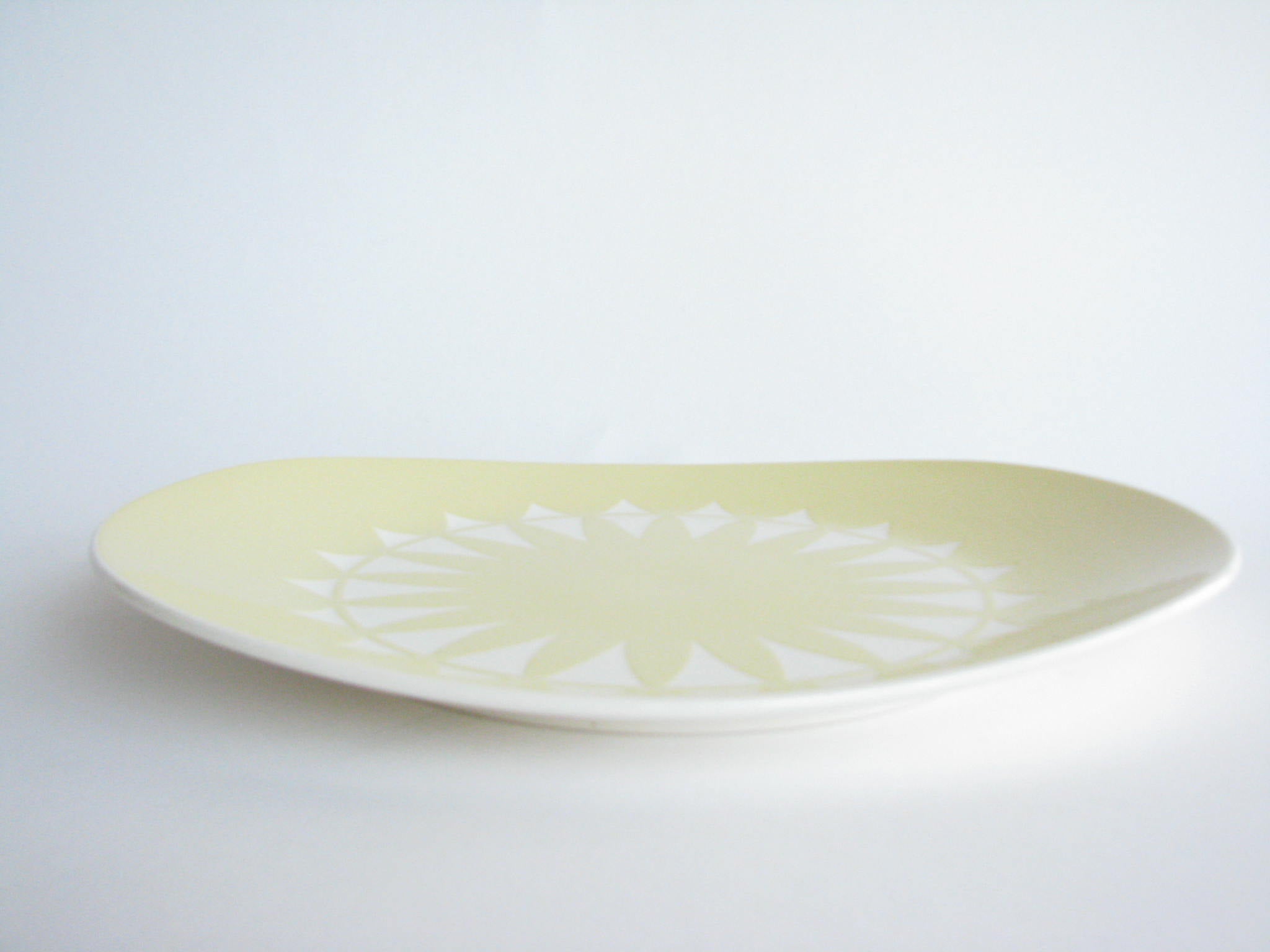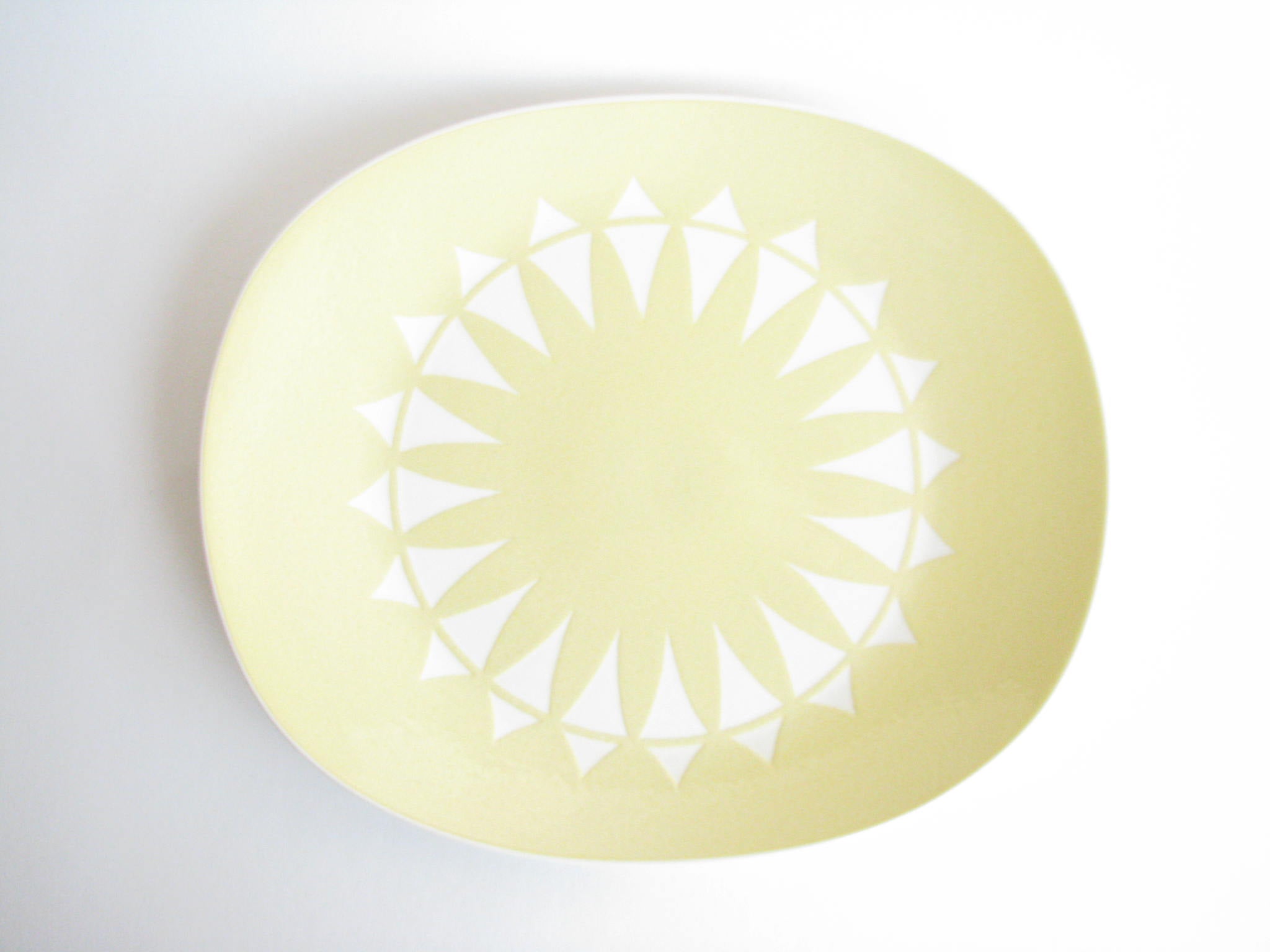 Vintage hand-painted pottery serving dish with rounded corners. Stamped on underside with artist signature.