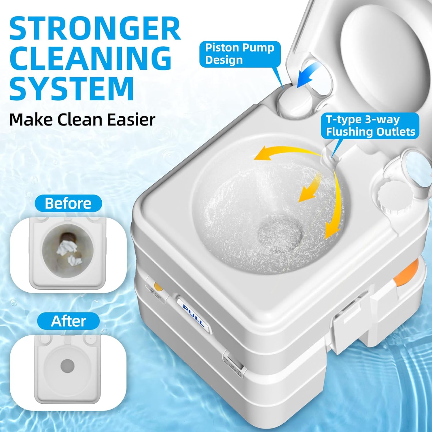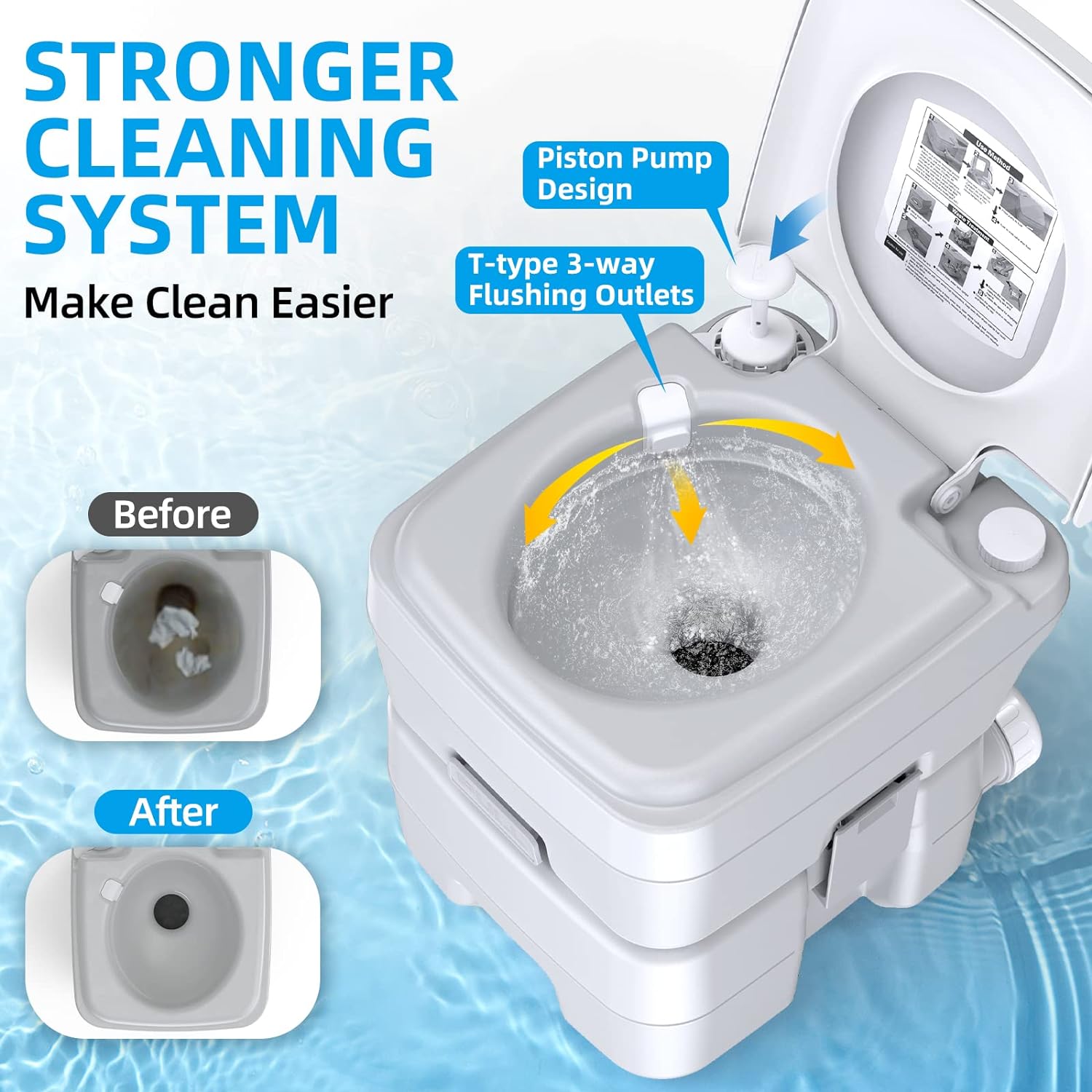 【Simple Operation】Before using the camping potty, remember to exhaust air pressure and pull the handle, close the toilet lid, and press the piston pump to clean the inside of the portable camping toilet