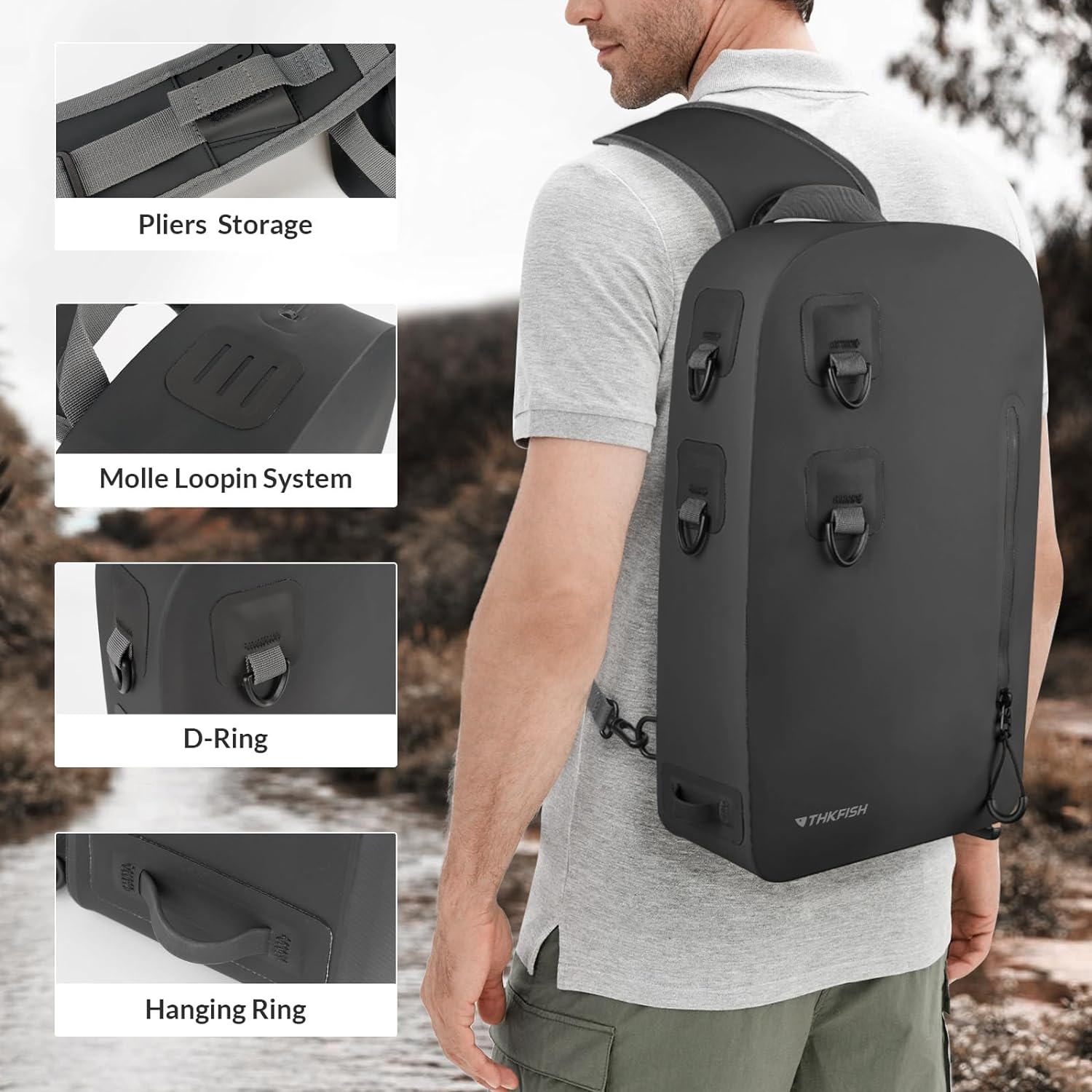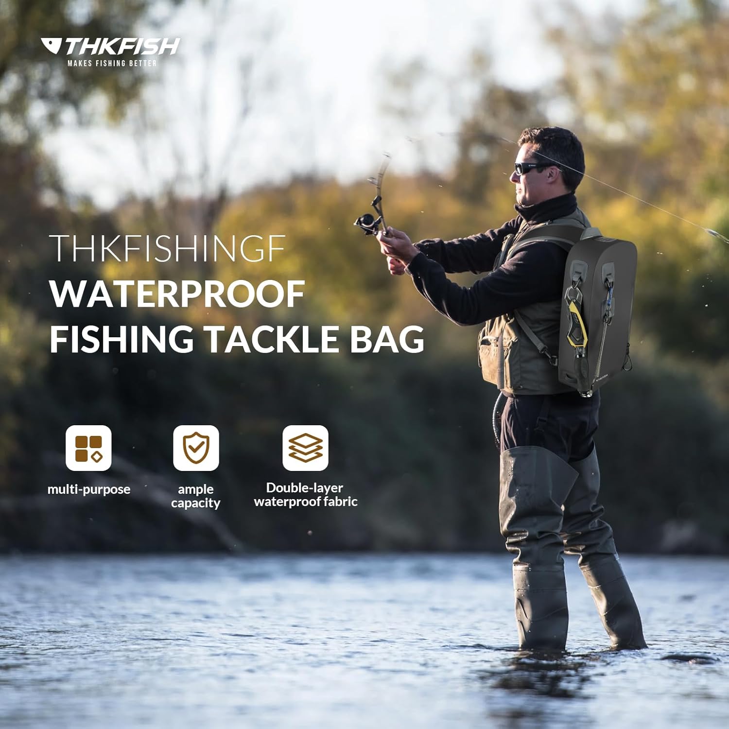 Waterproof Fishing Tackle Bag: Made of 840D oxford fabric and double-sided waterproof TPU coating, THKFISH waterproof fishing backpack is durable and waterproof. With its high-density construction, this fishing tackle bag not only ensures a formidable defense against water intrusion but also guarantees long-lasting performance in the face of rugged fishing environments. Perfect for fly fishing, kayaking, boating and other outdoor activities.