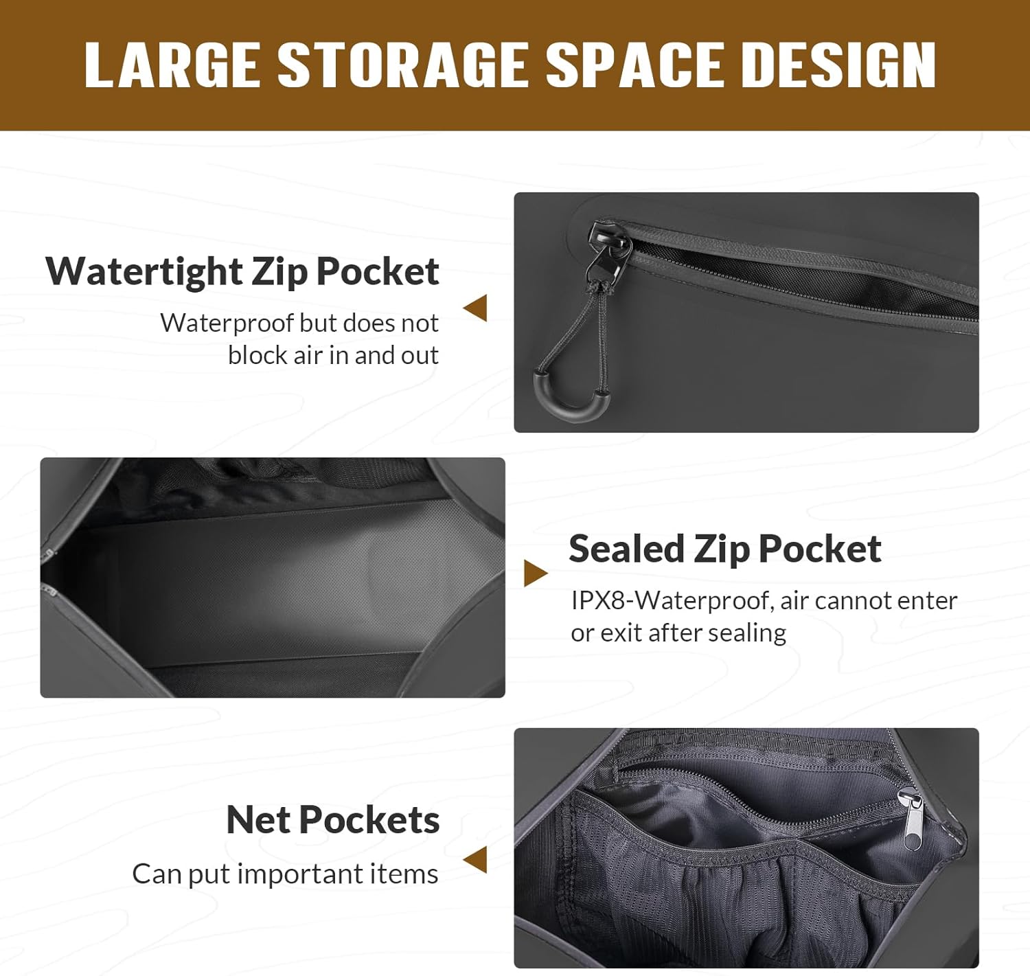 Airtight Zippers:The waterproof fishing backpack main compartment features a fully waterproof, TRU airtight zipper, IPX8 waterproof rating, with a safety pull at the end of the zipper. For airtight zippers please pull the zipper all the way to the end so that the zipper is fully closed, and before submerging the backpack in water, please press on the outside to make sure that there is no air leakage.The new zipper is a little tight, the airtight zipper will become smooth with more use.