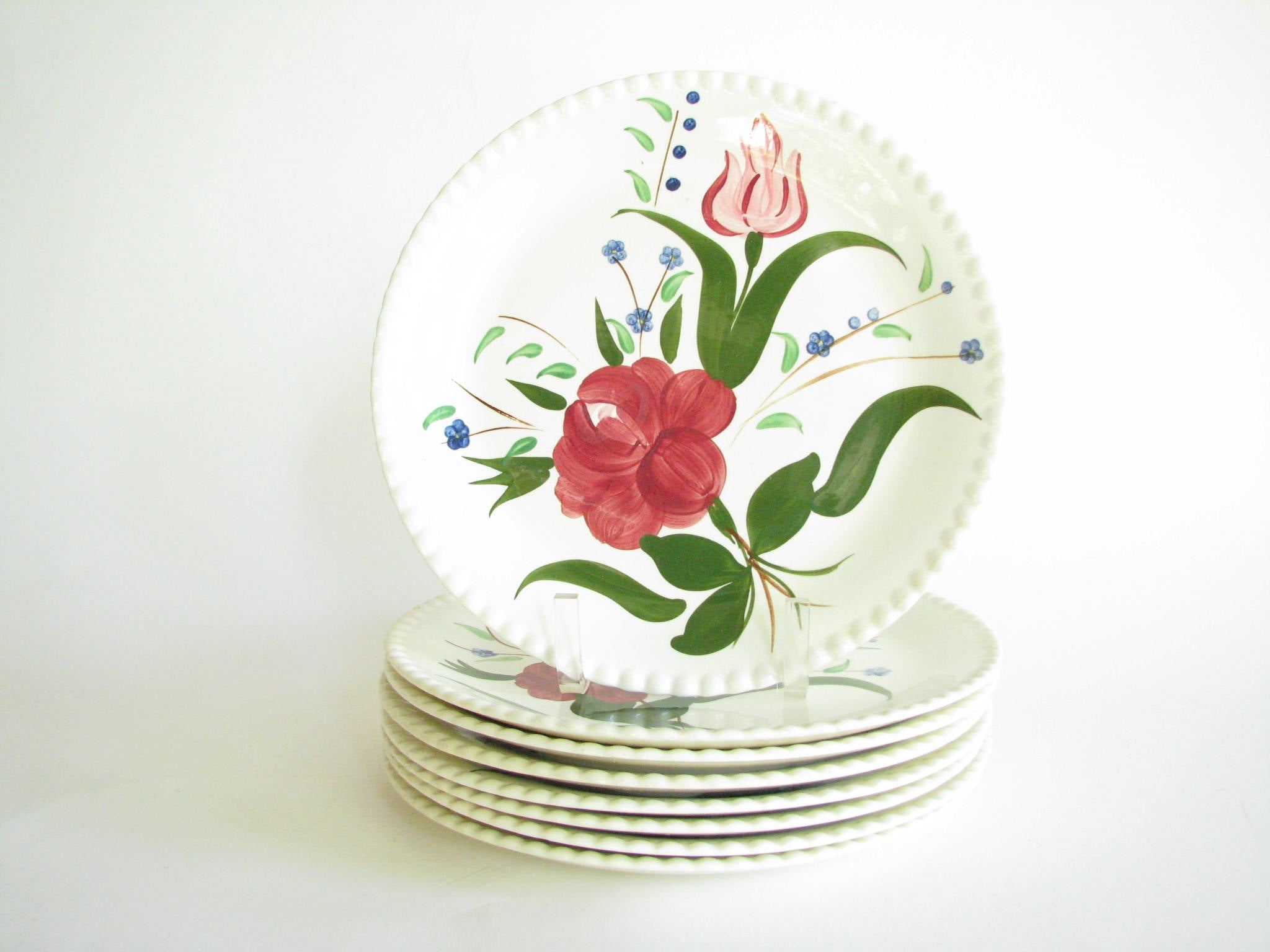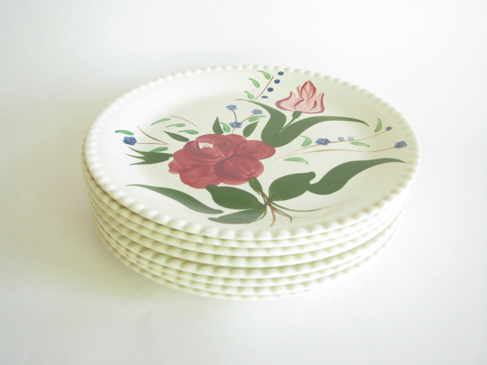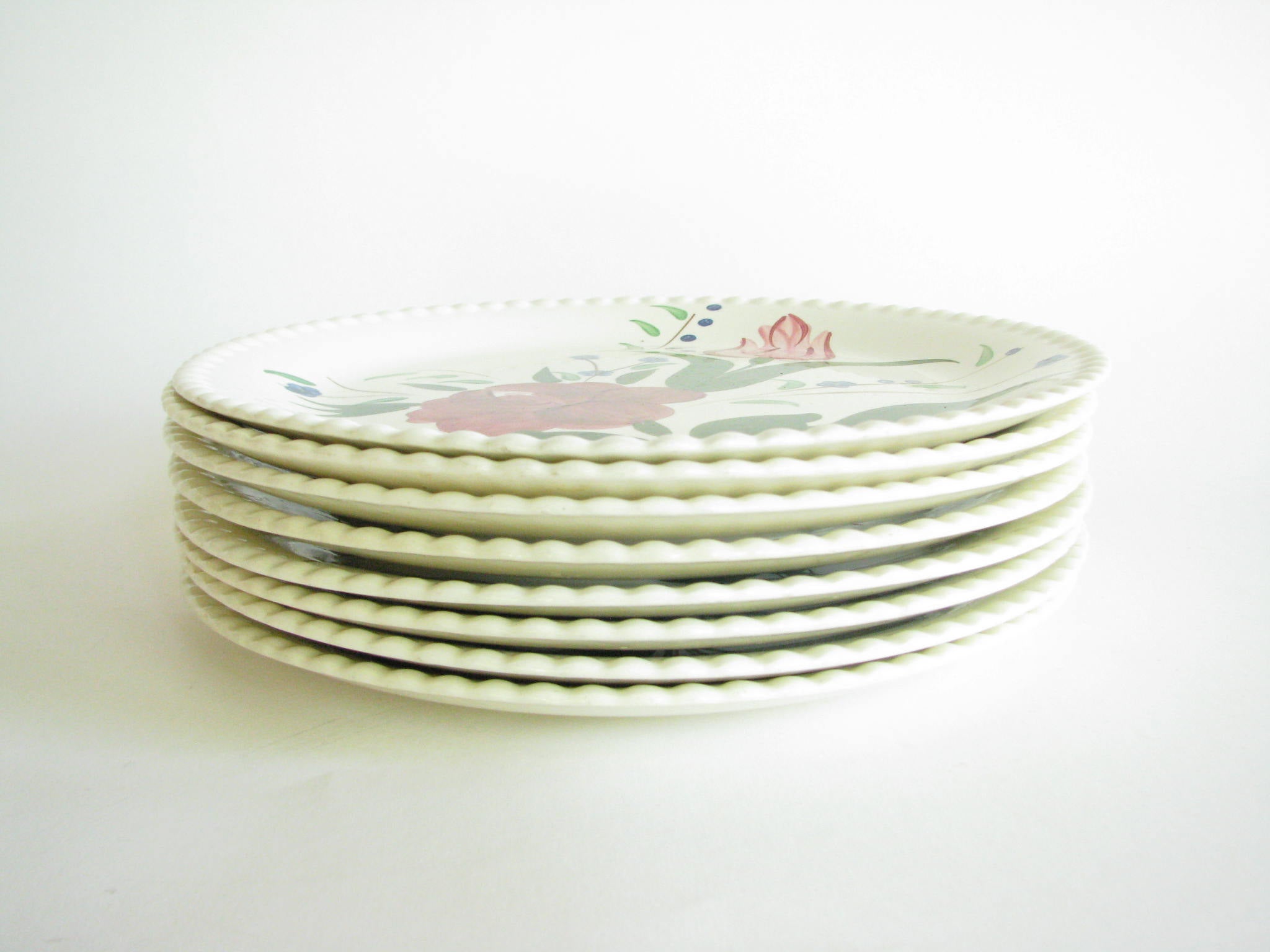 Vintage set of 6 Dansk New Scandia salad plates with blue trim and raised lattice edges.
