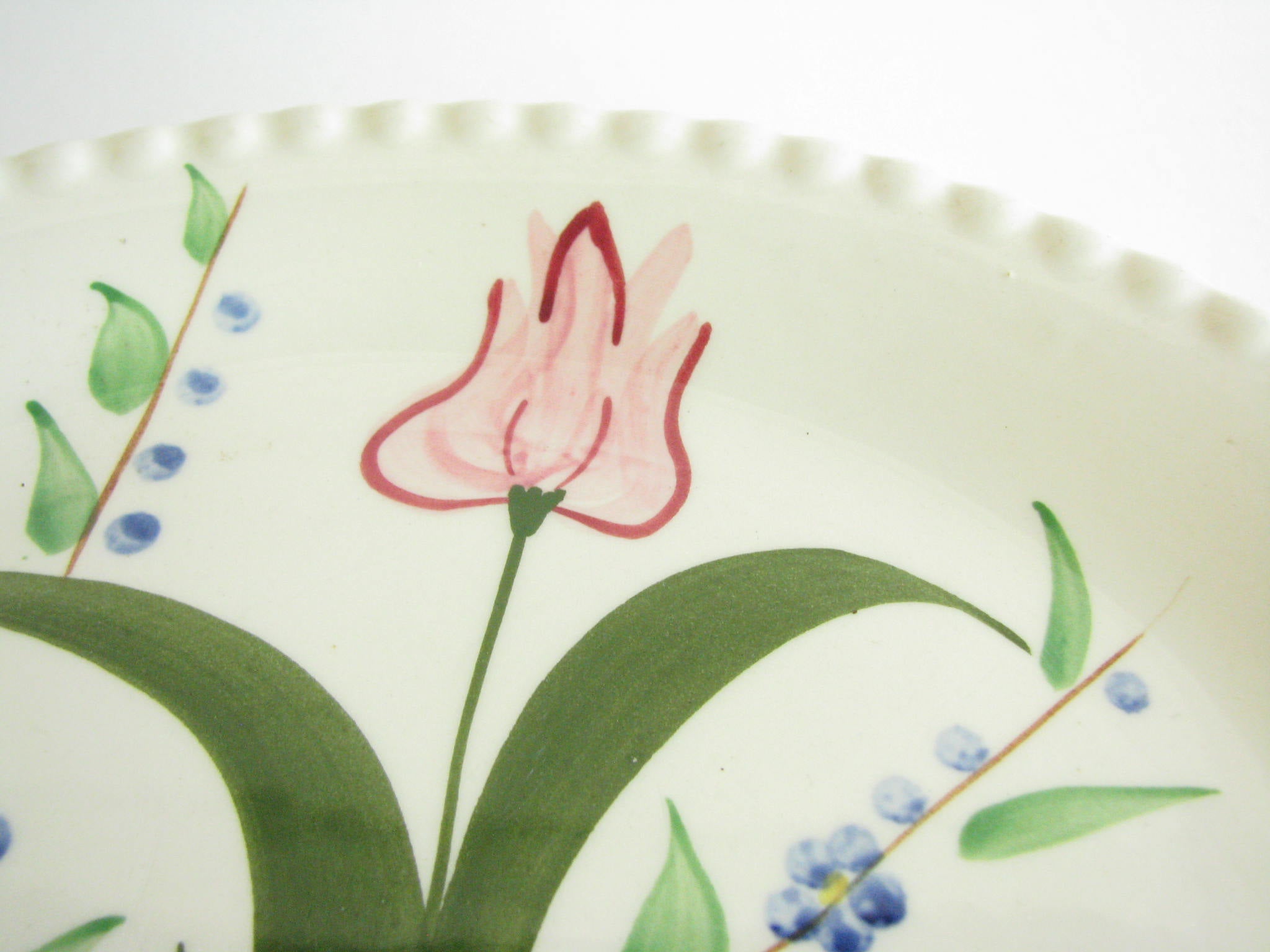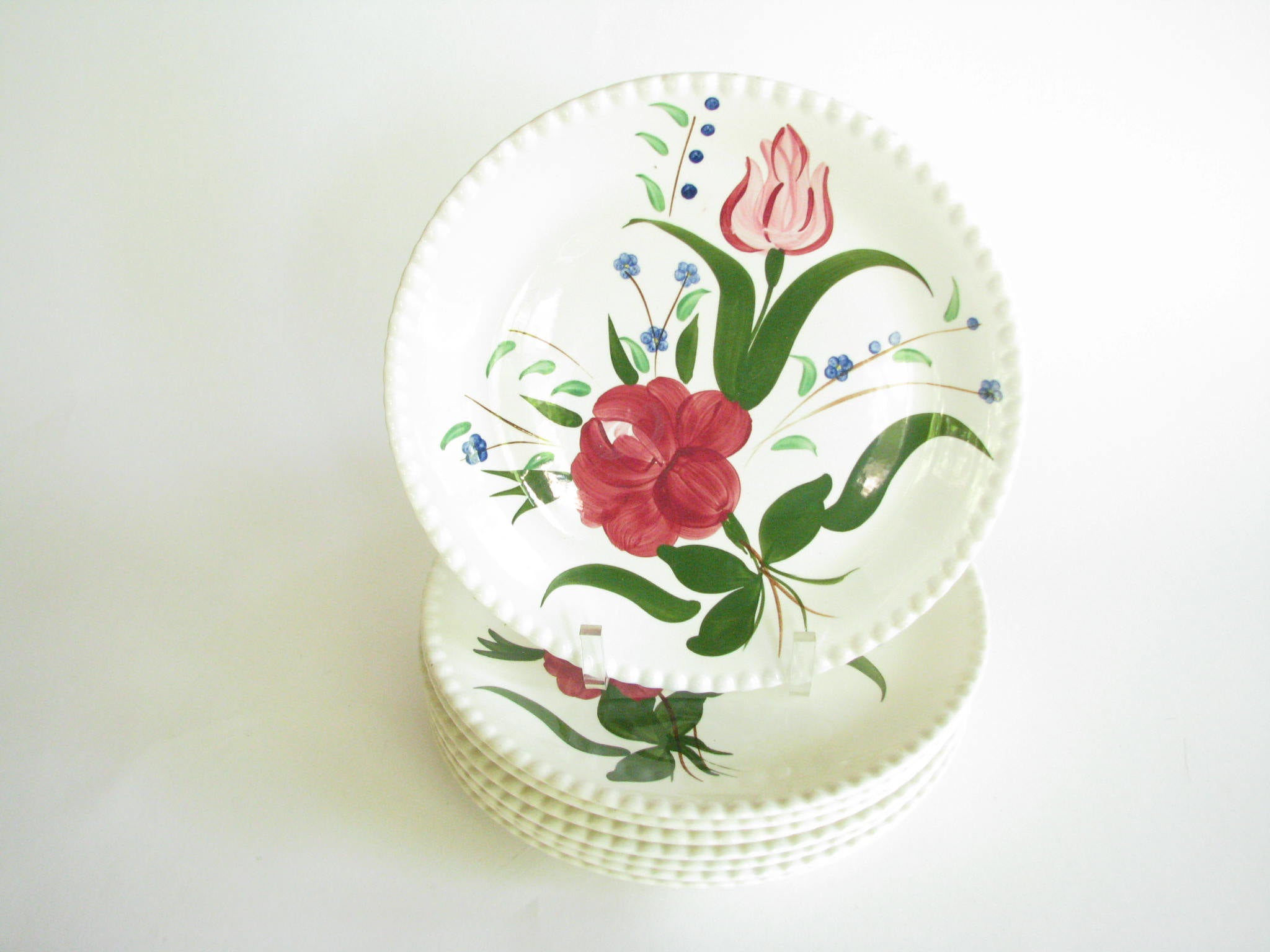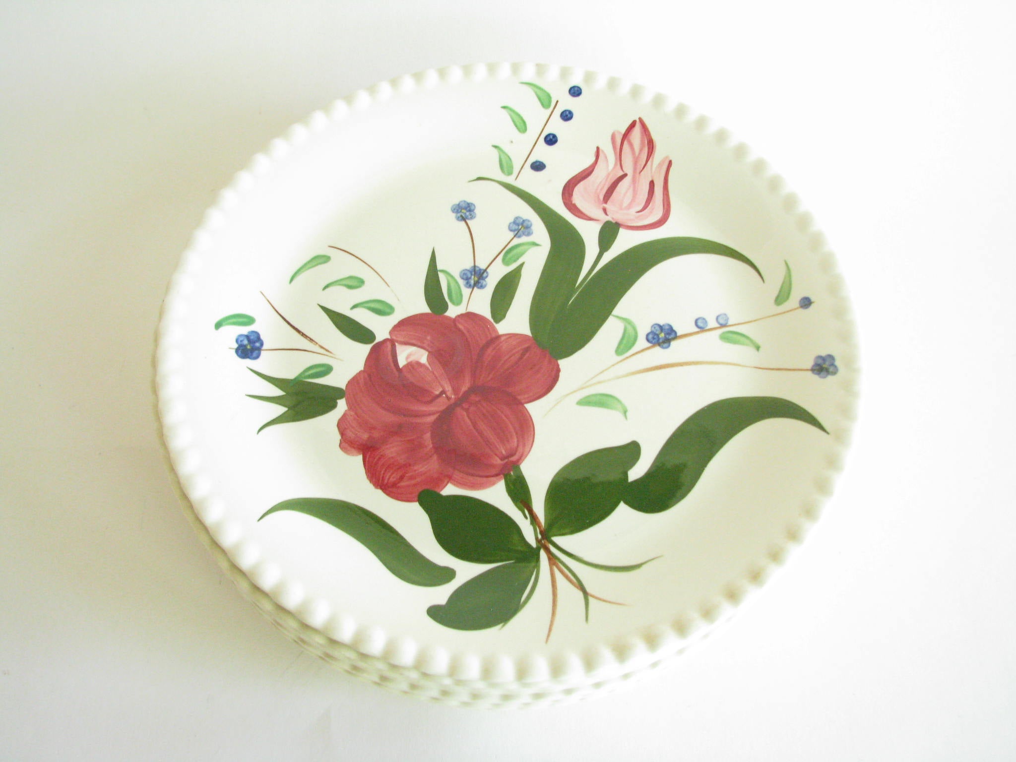 Vintage set of 6 Dansk New Scandia salad plates with blue trim and raised lattice edges.