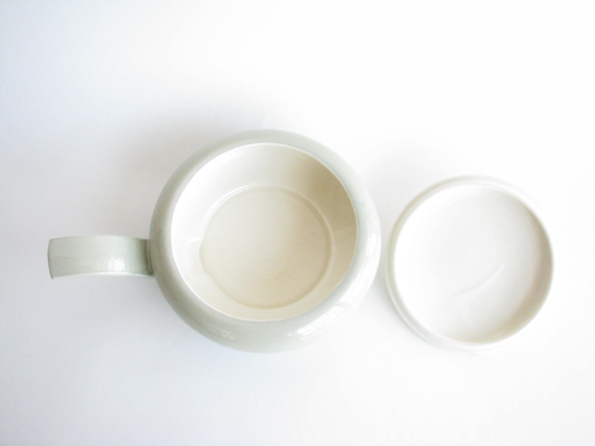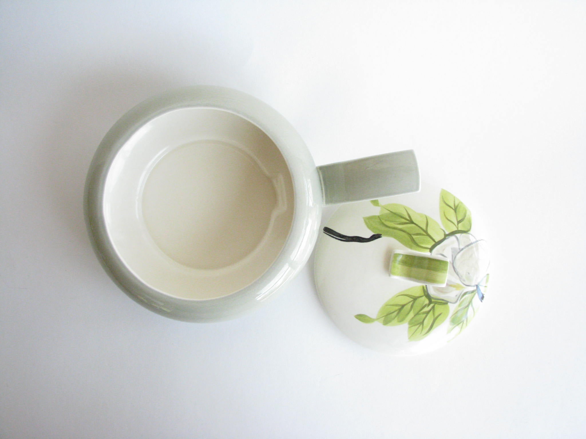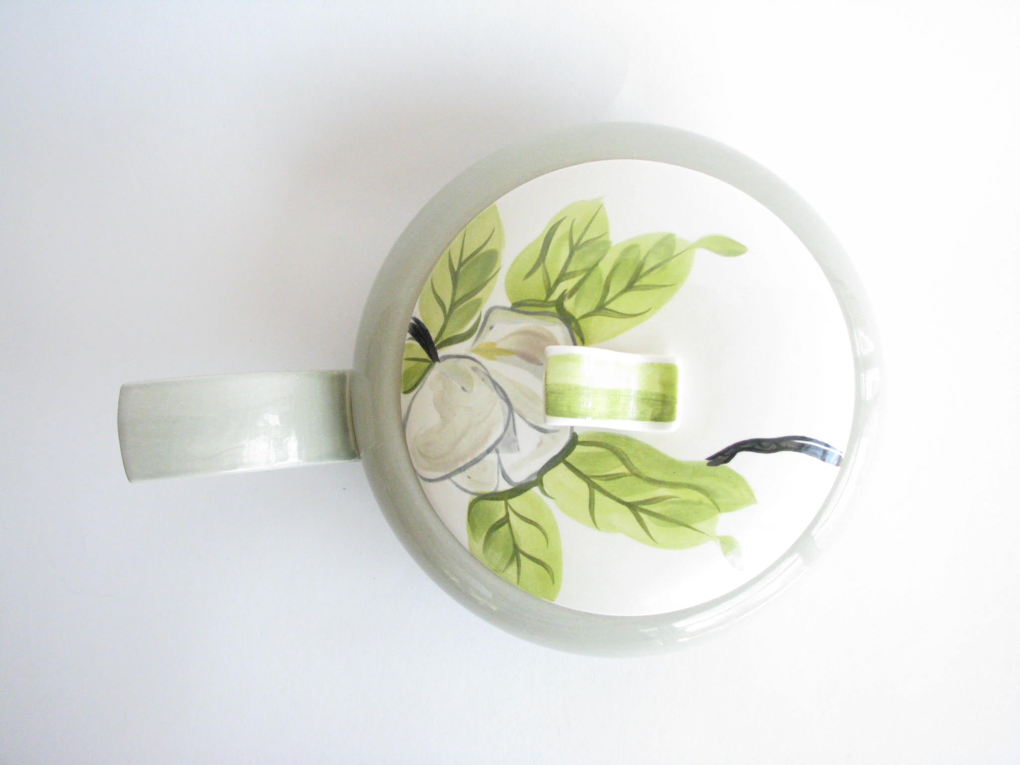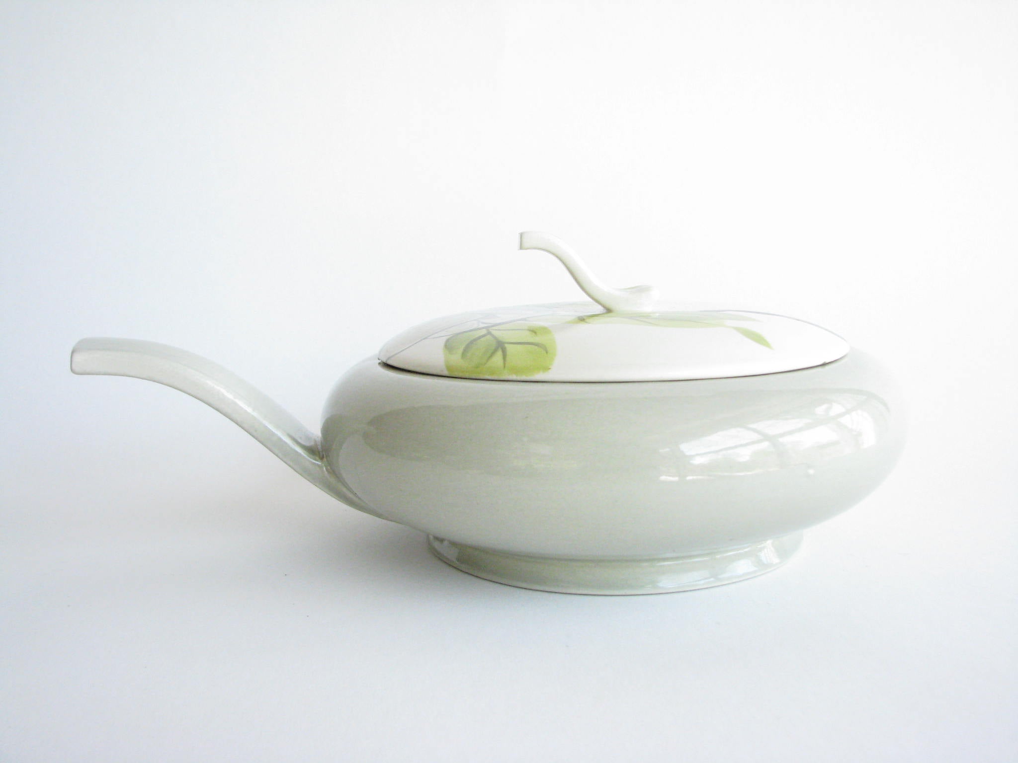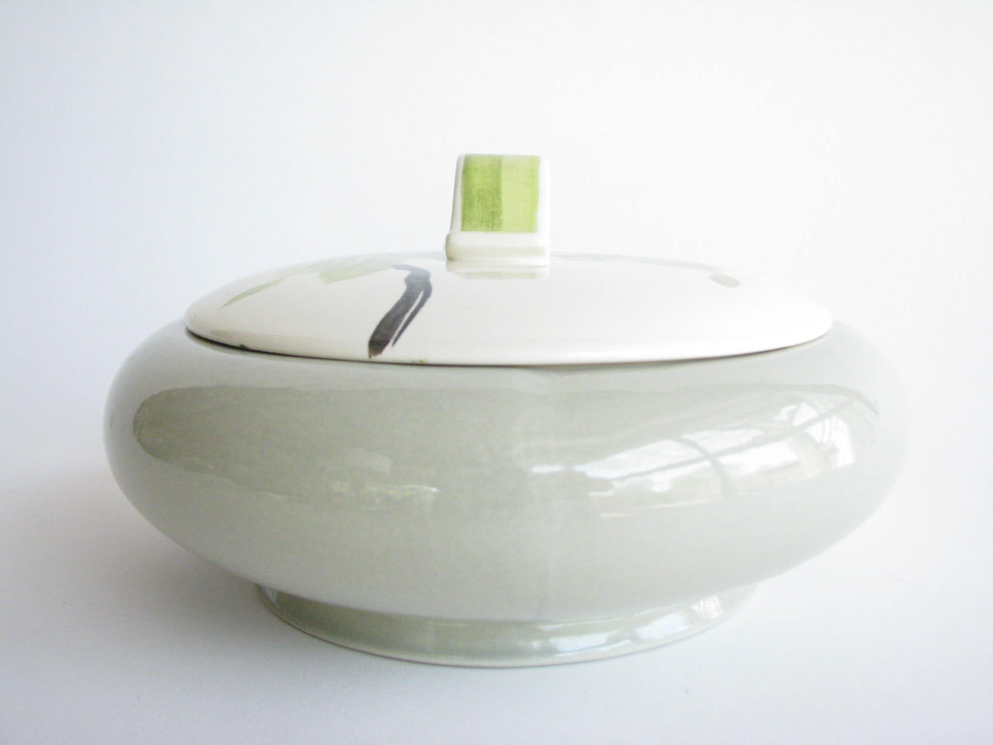 1940s Red Wing Potteries chartreuse Magnolia 1.25 quart lidded serving / casserole dish with sculptural handle and lid finial.