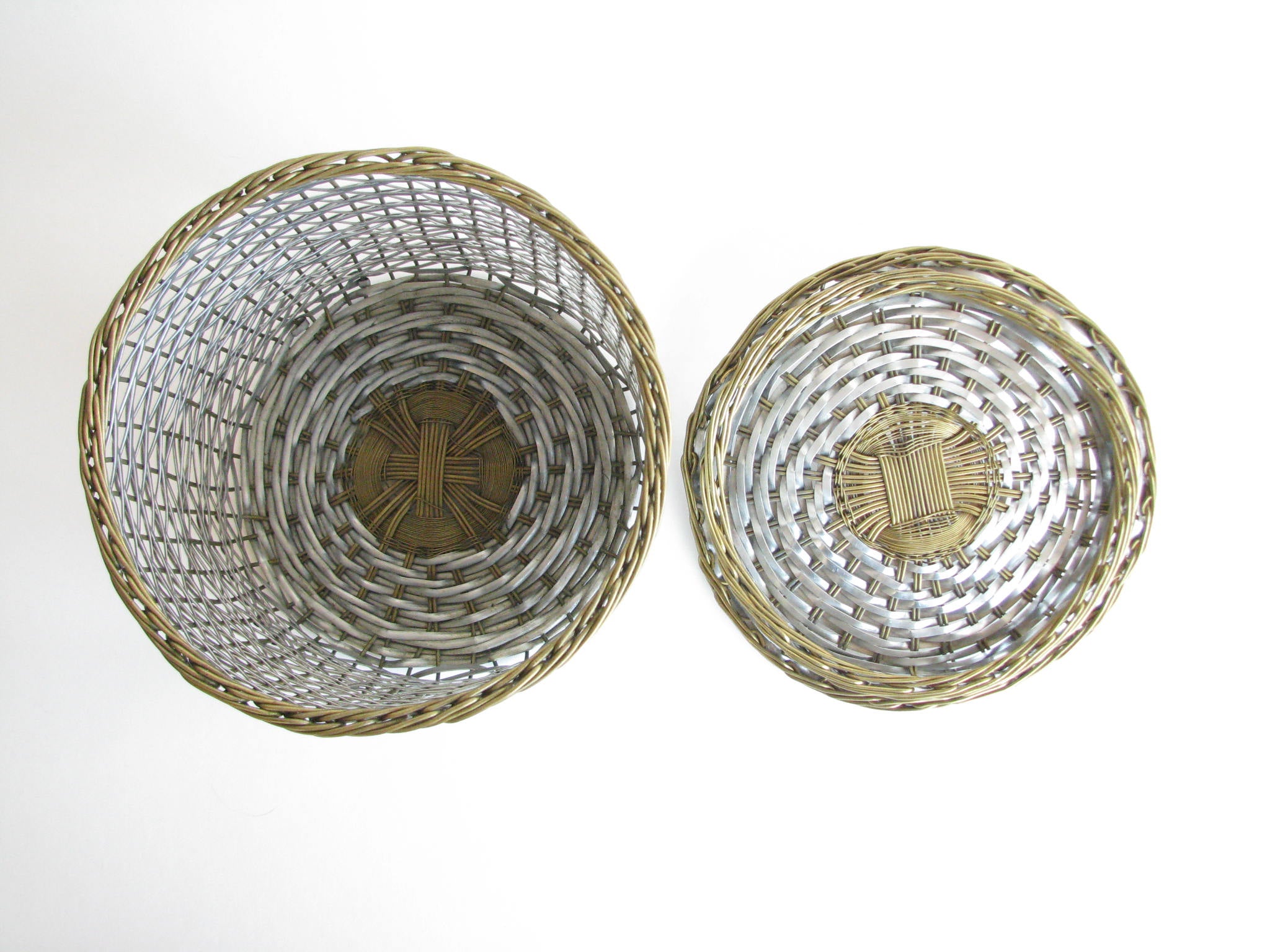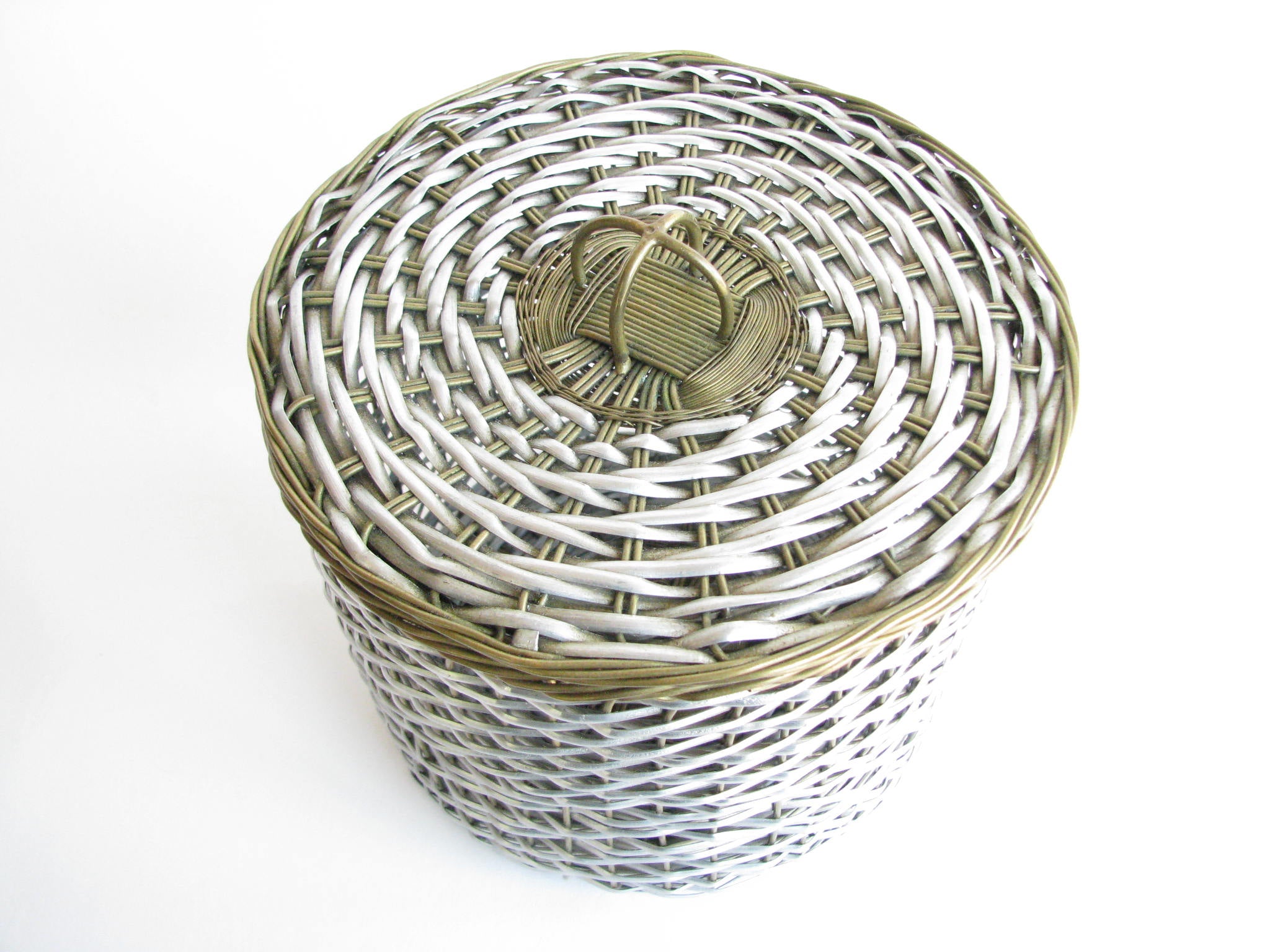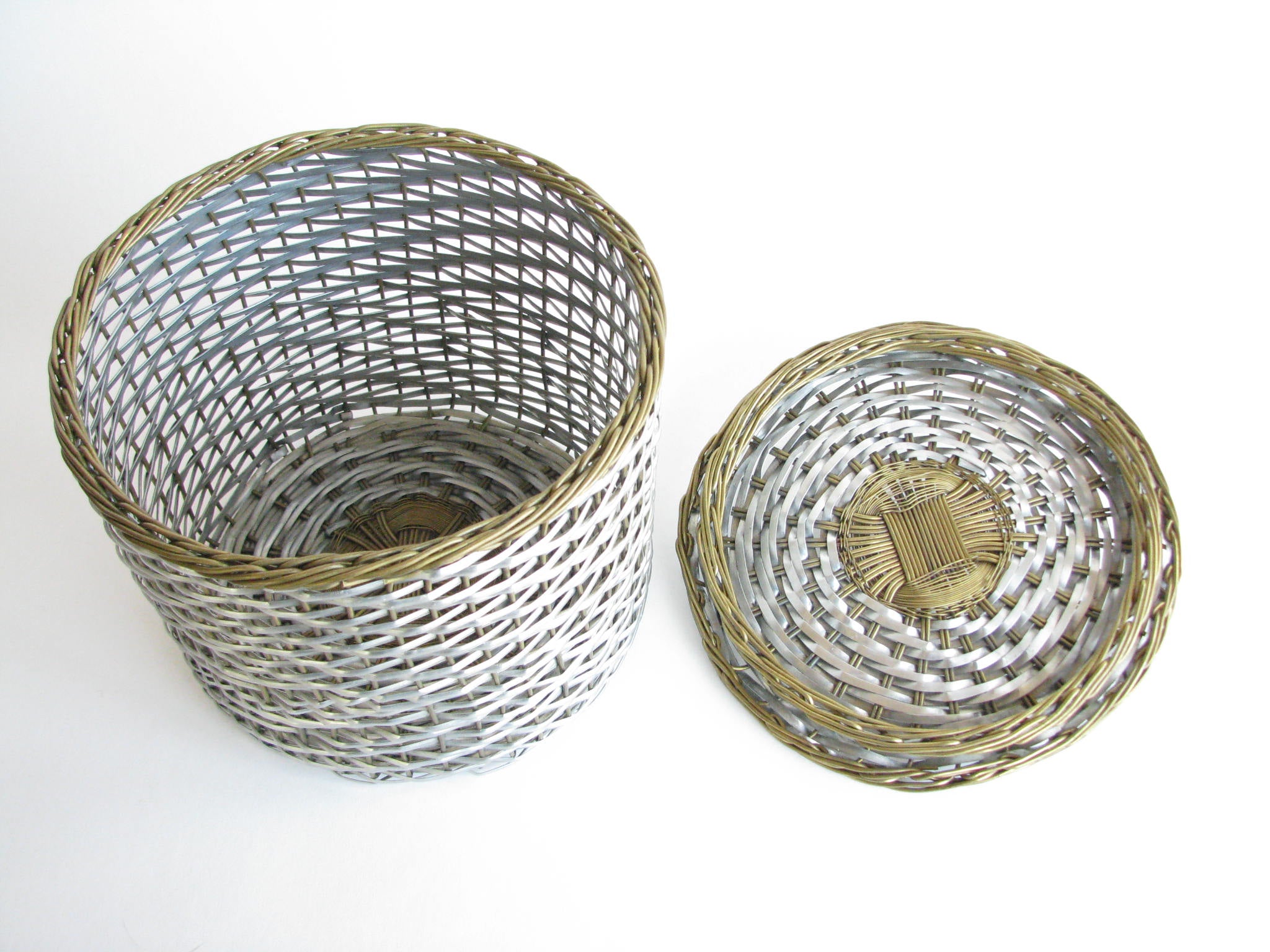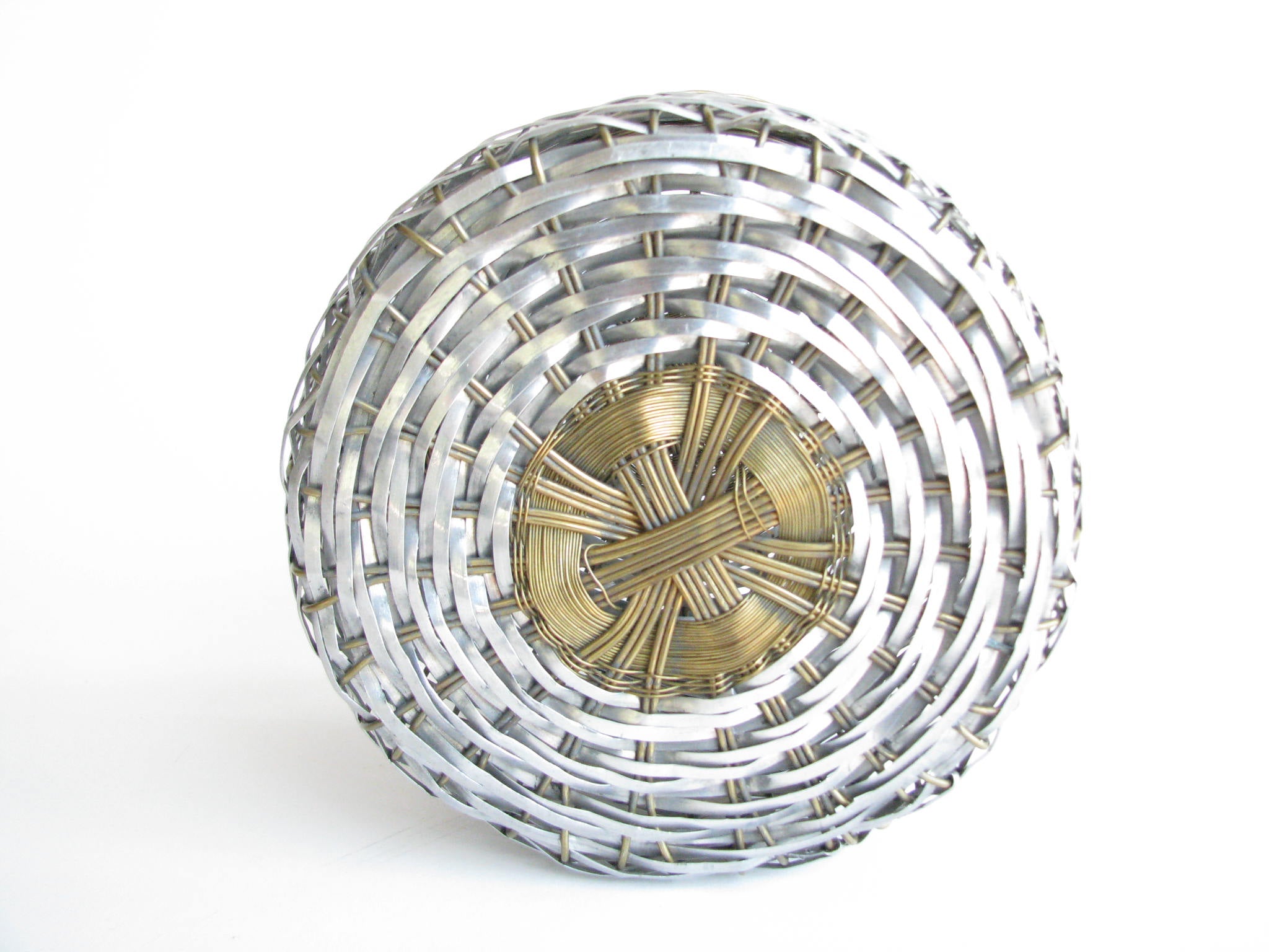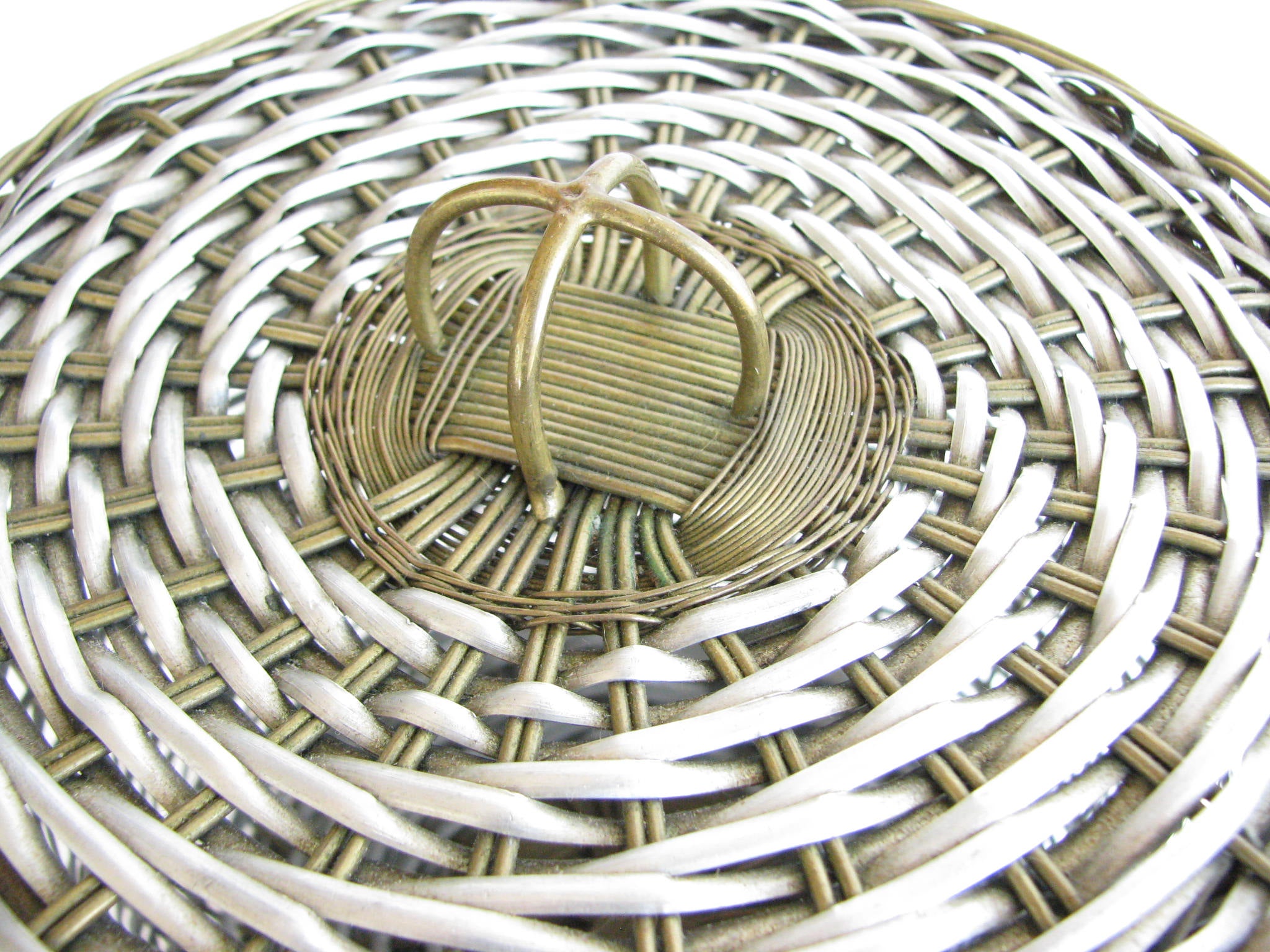 Vintage intricately woven metal wire lidded basket in silver and brass tones. Weaving is clean and tight, structure is solid.