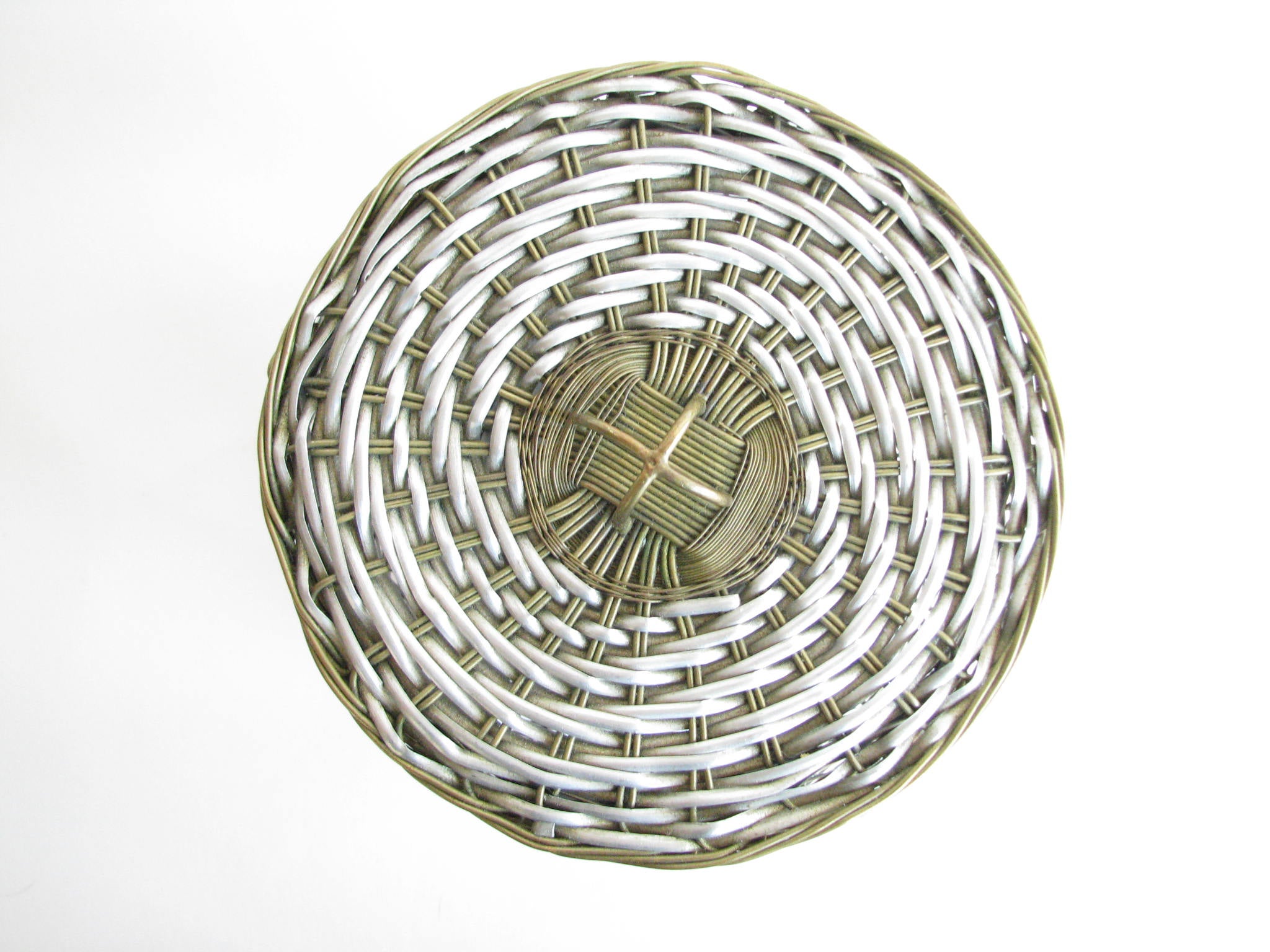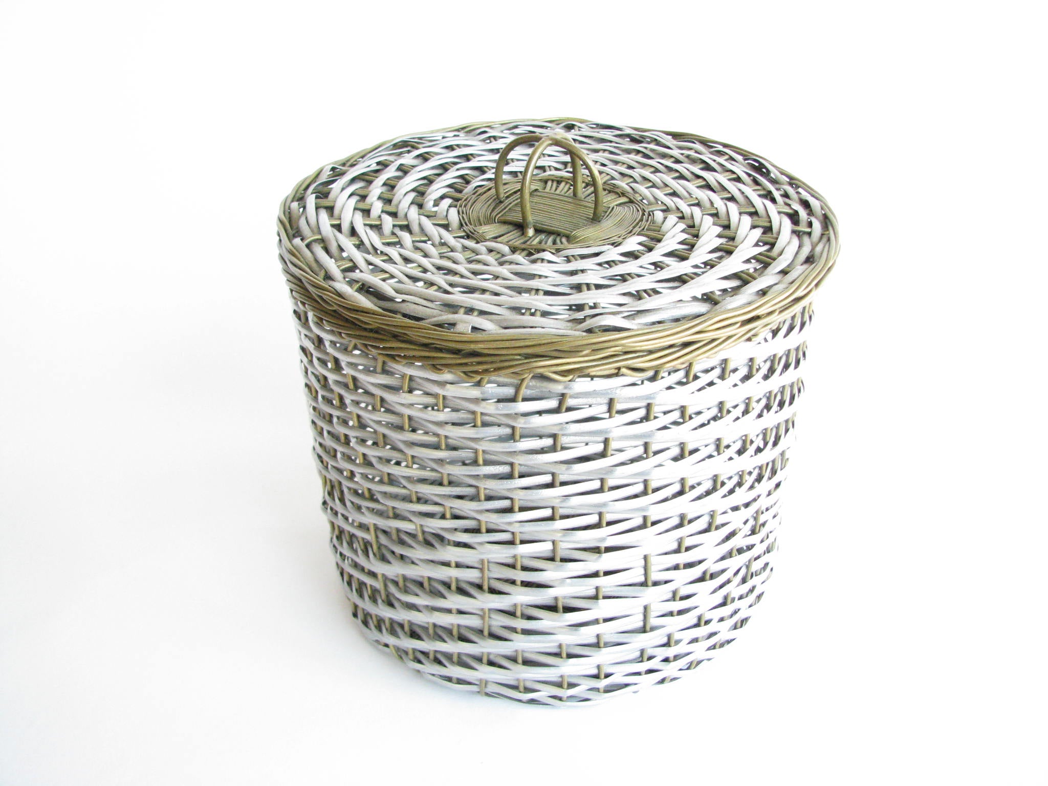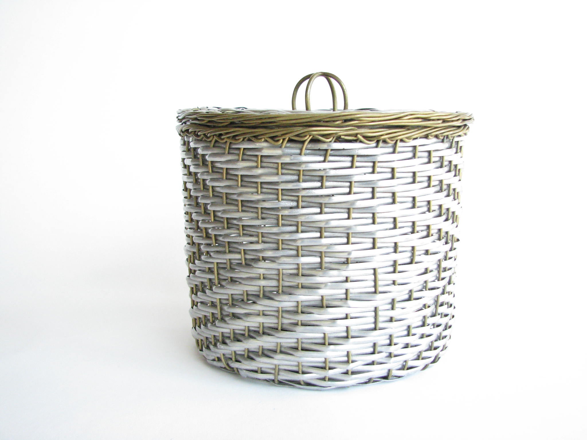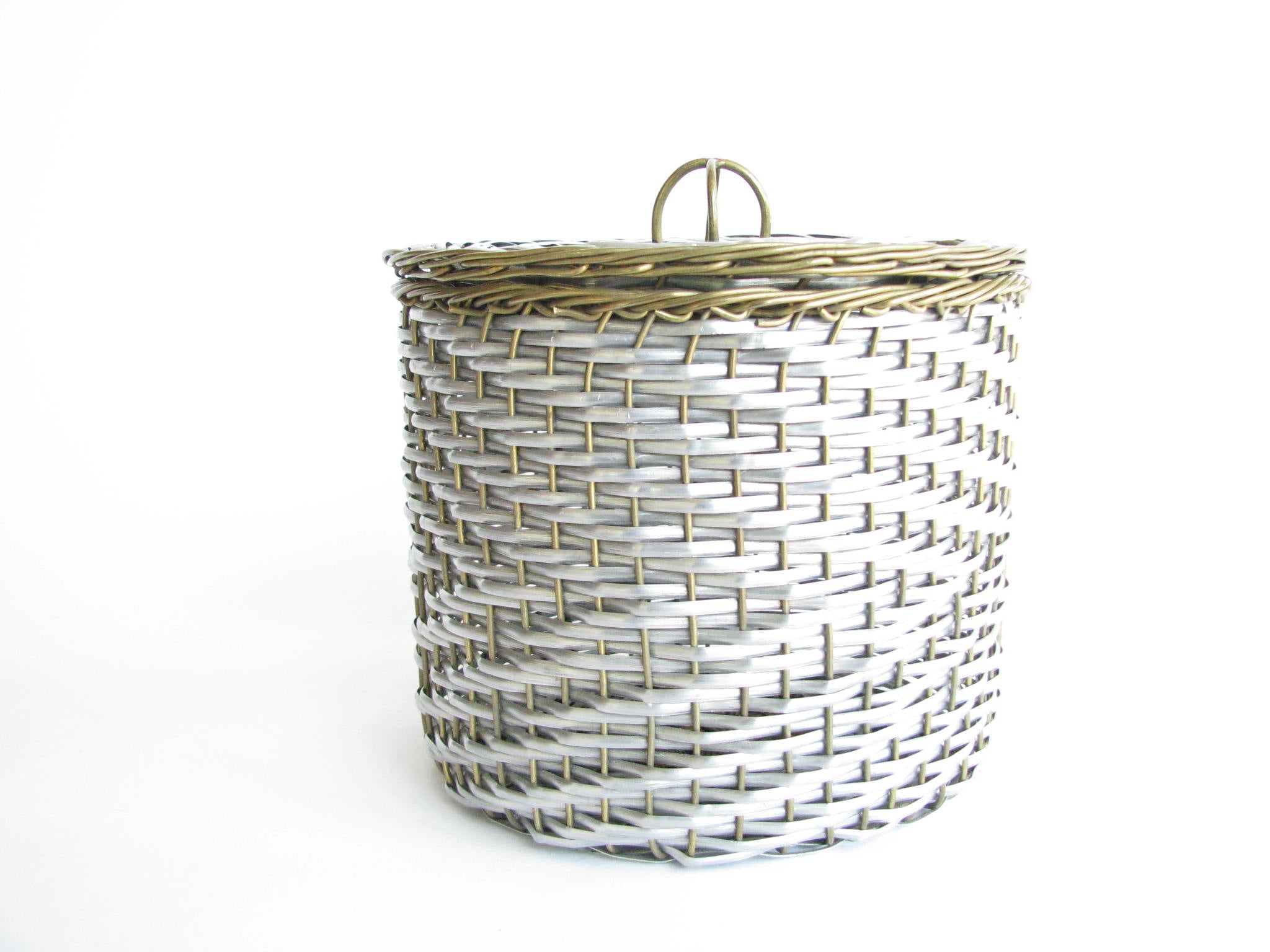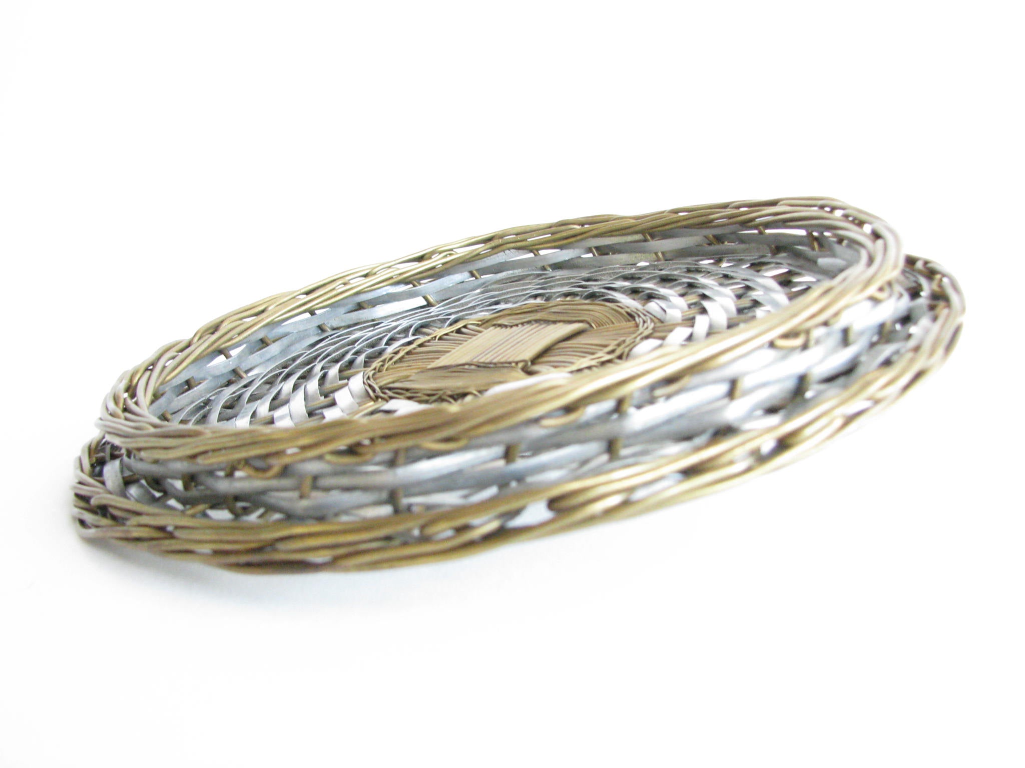 Vintage intricately woven metal wire lidded basket in silver and brass tones. Weaving is clean and tight, structure is solid.