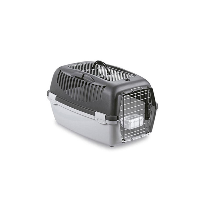 Practical and safe carrier for small sized pets, provided with: handle for transport, metal door with lock, water-basin and seat belts secure system. The 4 swivelling wheels set and the shoulder strap complete the product.